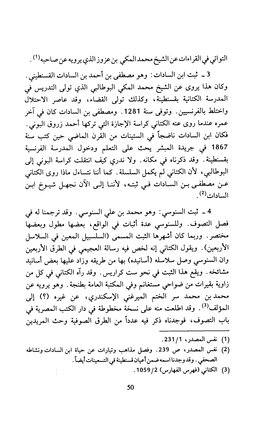3 - ثبت ابن السادات: وهو مصطفى بن أحمد بن السادات القسنطيني. وكان هذا يروى عن الشيخ محمد المكي البوطالبي الذي تولى التدريس في المدرسة الكتانية بقسنطينة، وكذلك تولى القضاء، وقد عاصر الاحتلال واختلط بالفرنسيين. وتوفى سنة 1281. ومصطفى بن السادات كان في آخر عمره عندما روى عنه الكتاني كراسة الإجازة التي تركها أحمد زروق البوني. فكان ابن السادات ناضجا في الستينات من القرن الماضي حين كتب سنة 1867 في جريدة المبشر يحث على التعلم ودخول المدرسة الفرنسية بقسنطينة. وقد ذكرناه في مكانه. ولا ندري كيف انتقلت كراسة البوني إلى البوطالبي، لأن الكتاني لم يكمل السلسلة. كما أننا نتساءل ماذا روى الكتاني عن مصطفى بن السادات في ثبته، لأننا إلى الآن نجهل شيوخ ابن السادات (¬2).