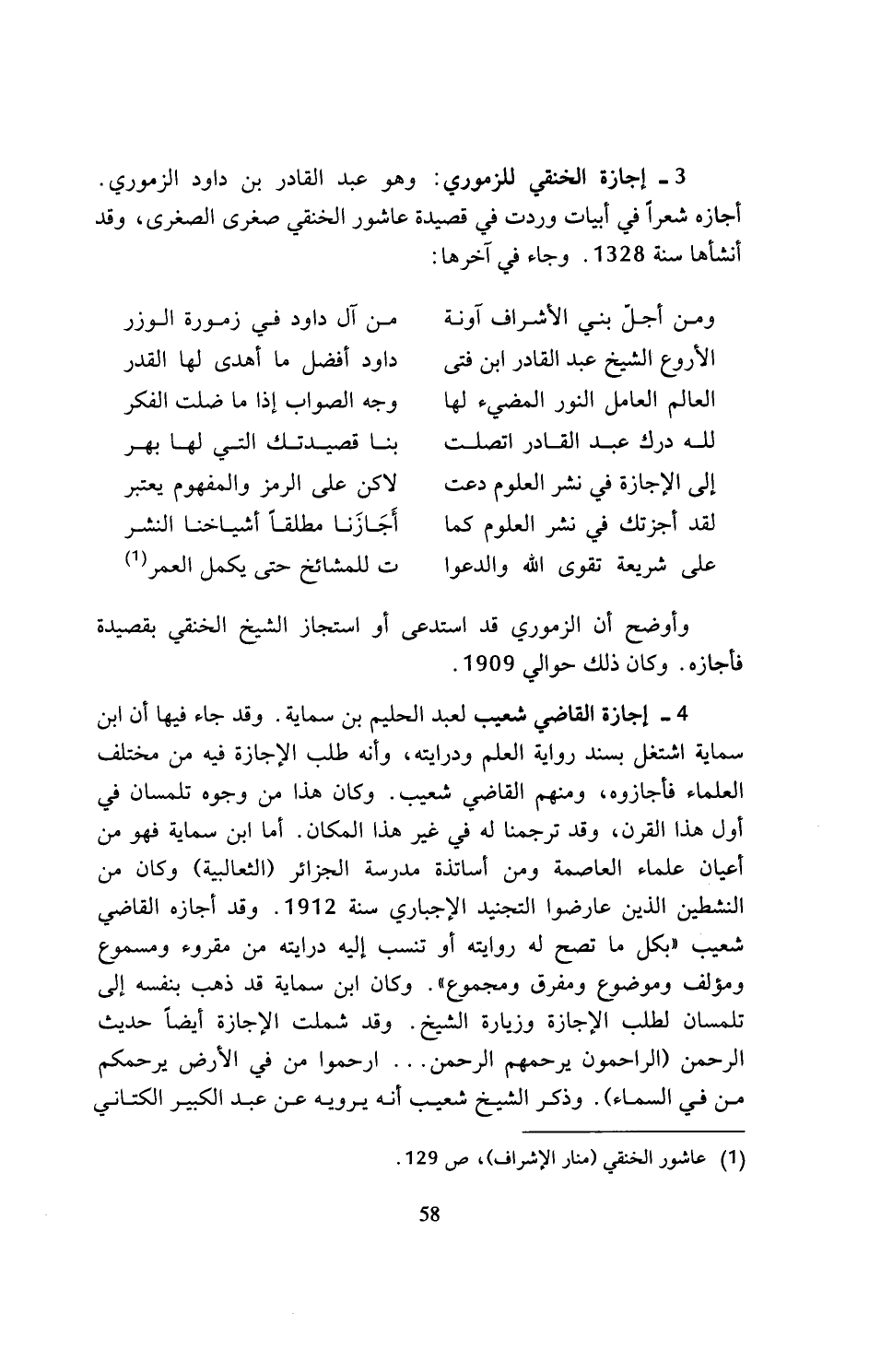 وأوضح أن الزموري قد استدعى أو استجاز الشيخ الخنقي بقصيدة فأجازه. وكان ذلك حوالي 1909.