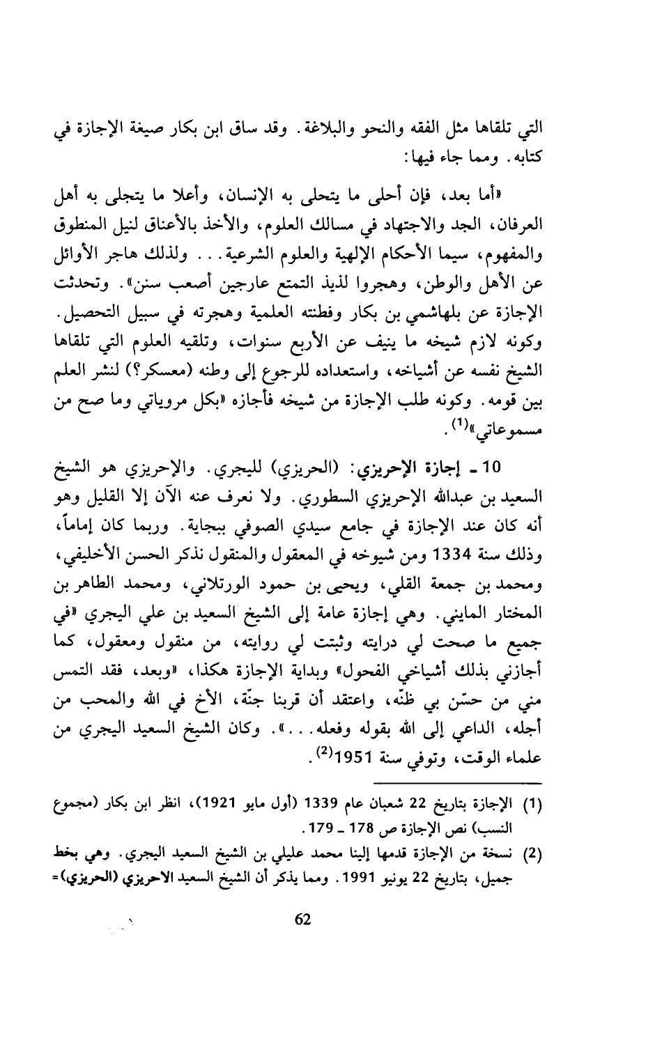 (¬2) نسخة من الإجازة قدمها إلينا محمد عليلي بن الشيخ السعيد اليجري. وهي بخط جميل، بتاريخ 22 يونيو 1991. ومما يذكر أن الشيخ السعيد الاحريزي (الحريزي) =