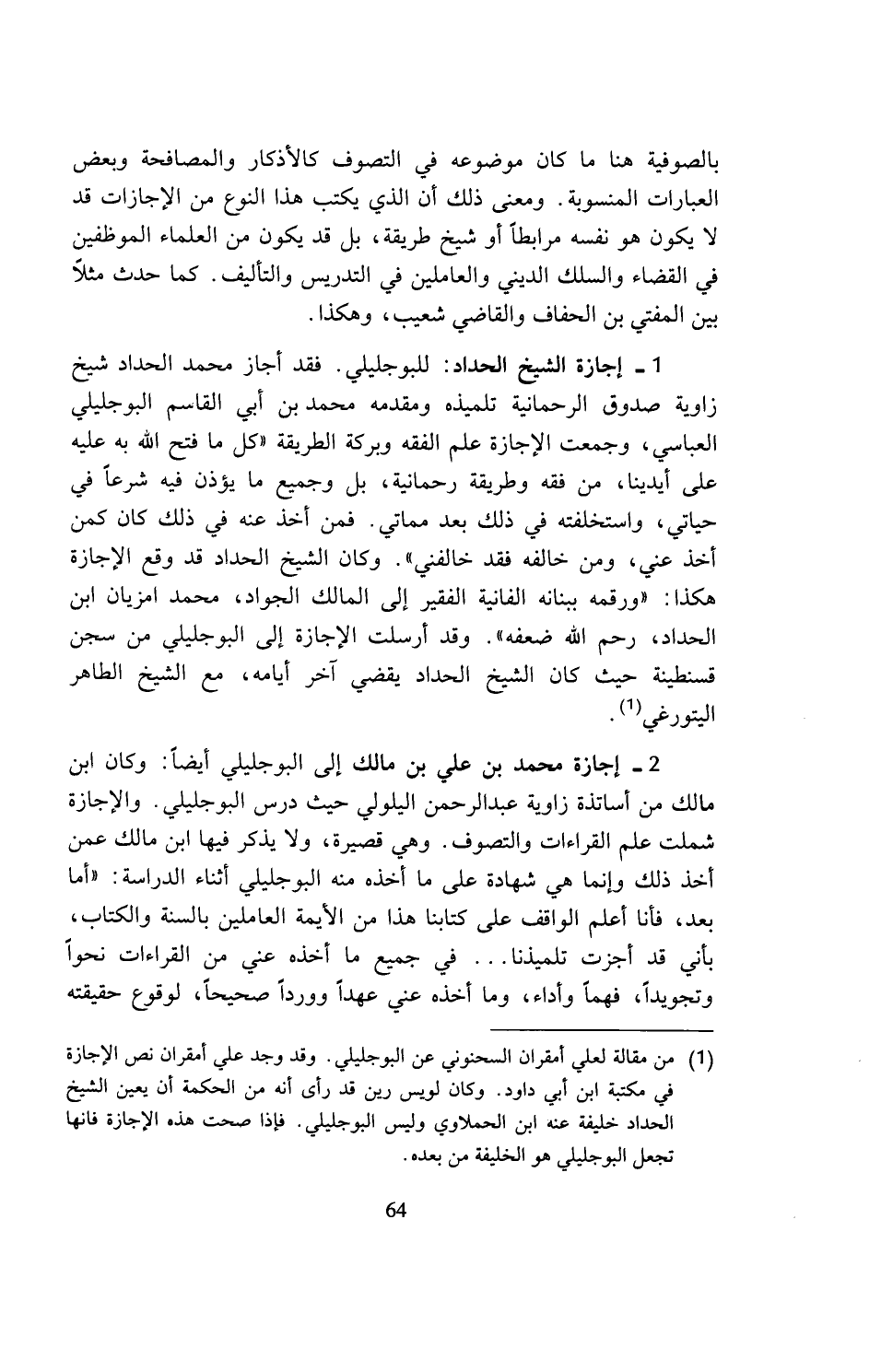 (¬1) من مقالة لعلي أمقران السحنوني عن البوجليلي. وقد وجد علي أمقران نص الإجازة في مكتبة ابن أبي داود. وكان لويس رين قد رأى أنه من الحكمة أن يعين الشيخ الحداد خليفة عنه ابن الحملاوي وليس البوجليلي. فإذا صحت هذه الإجازة فانها تجعل البوجليلي هو الخليفة من بعده.