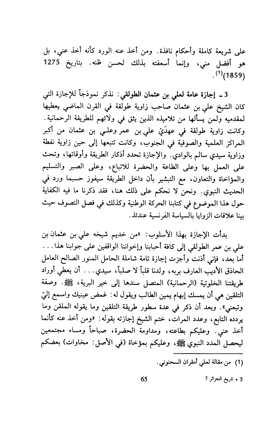 3 - إجازة عامة لعلي بن عثمان الطولقي: نذكر نموذجا للإجازة التي كان الشيخ علي بن عثمان صاحب زاوية طولقة في القرن الماضي يعطيها لمقدميه ولمن يسألها من تلاميذه الذين يثق في ولائهم للطريقة الرحمانية. وكانت زاوية طولقة في عهدي علي بن عمر وعلي بن عثمان من أكبر المراكز العلمية والصوفية في الجنوب، وكانت تتبعها إلى حين زاوية نفطة وزاوية سيدي سالم بالوادي. والإجازة تحدد أذكار الطريقة وأوقاتها، وتحث على العمل بها وعلى الطاعة والحضرة للاتباع، وعلى الصبر والتسليم والمؤاخاة والتعاون، مع التبشير بأن داخل الطريقة سيفوز حسبما ورد في الحديث النبوي. ونحن لا نحكم على ذلك هنا، فقد ذكرنا ما فيه الكفاية حول هذا الموضوع في كتابنا الحركة الوطنية وكذلك في فصل التصوف حيث بينا علاقات الزوايا بالسياسة الفرنسية عندئذ.