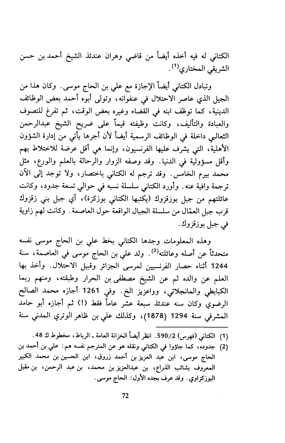وهذه المعلومات وجدها الكتاني بخط علي بن الحاج موسى نفسه متحدثا عن أصله وعائلته (¬2). ولد علي بن الحاج موسى في العاصمة، سنة 1244 أثناء حصار الفرنسيين لمرسى الجزائر وقبيل الاحتلال. وأخذ بها العلم عن والده ثم عن الشيخ مصطفى بن الحرار وطبقته، ومنهم ربما الكبابطي والمانجلاتي، وواعزيز الخ. وفي 1261 أجازه محمد الصالح الرضوي وكان سنه عندئذ سبعة عشر عاما فقط (!) ثم أجازه أبو حامد المشرفي سنة 1294 (1878)، وكذلك علي بن ظاهر الوتري المدني سنة