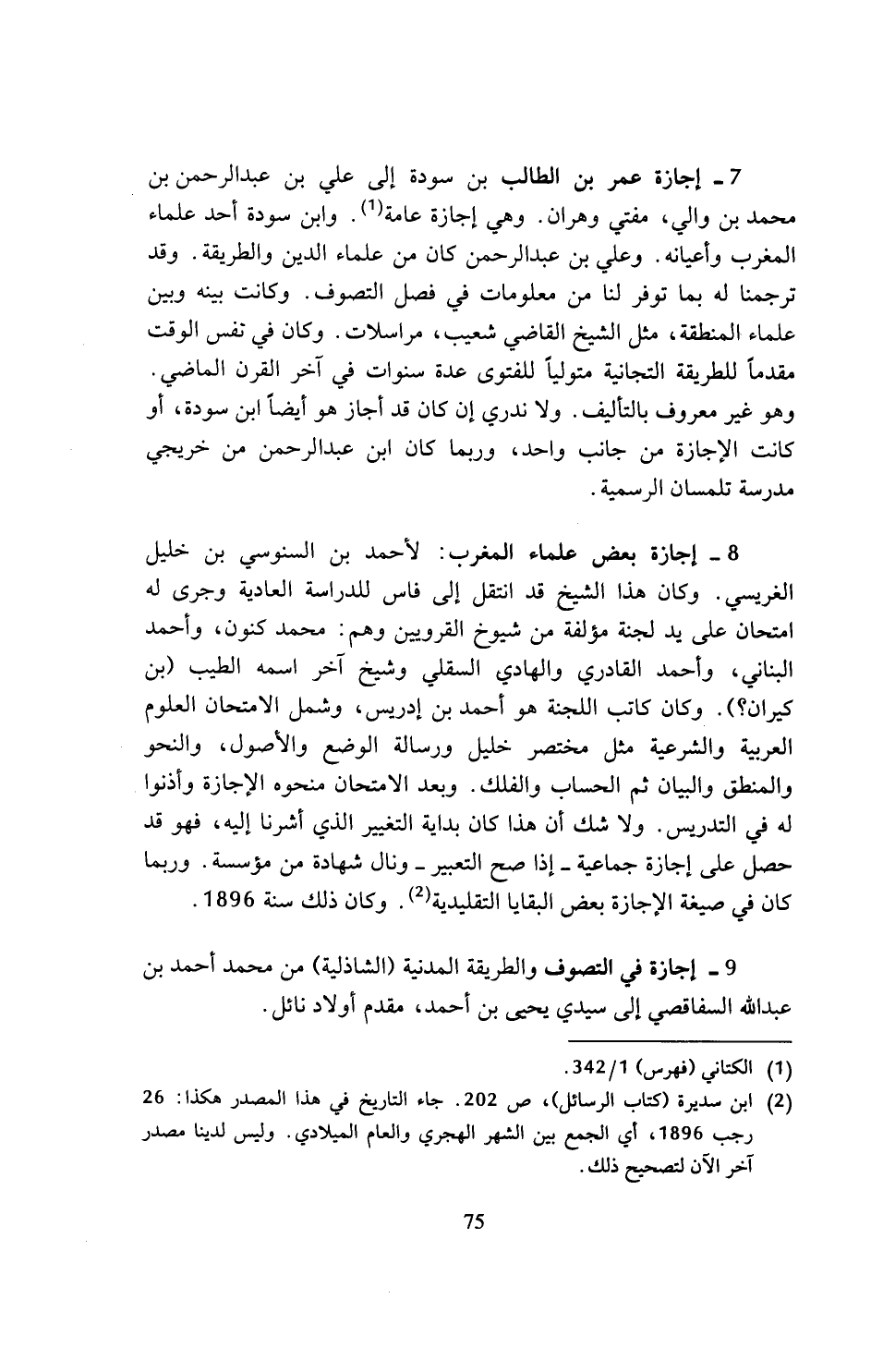 8 - إجازة بعض علماء المغرب: لأحمد بن السنوسي بن خليل الغريسي. وكان هذا الشيخ قد انتقل إلى فاس للدراسة العادية وجرى له امتحان على يد لجنة مؤلفة من شيوخ القرويين وهم: محمد كنون، وأحمد البناني، وأحمد القادري والهادي السقلي وشيخ آخر اسمه الطيب (بن كيران؟). وكان كاتب اللجنة هو أحمد بن إدريس، وشمل الامتحان العلوم العربية والشرعية مثل مختصر خليل ورسالة الوضع والأصول، والنحو والمنطق والبيان ثم الحساب والفلك. وبعد الامتحان منحوه الإجازة وأذنوا له في التدريس. ولا شك أن هذا كان بداية التغيير الذي أشرنا إليه، فهو قد حصل على إجازة جماعية - إذا صح التعبير - ونال شهادة من مؤسسة. وربما كان في صيغة الإجازة بعض البقايا التقليدية (¬2). وكان ذلك سنة 1896.