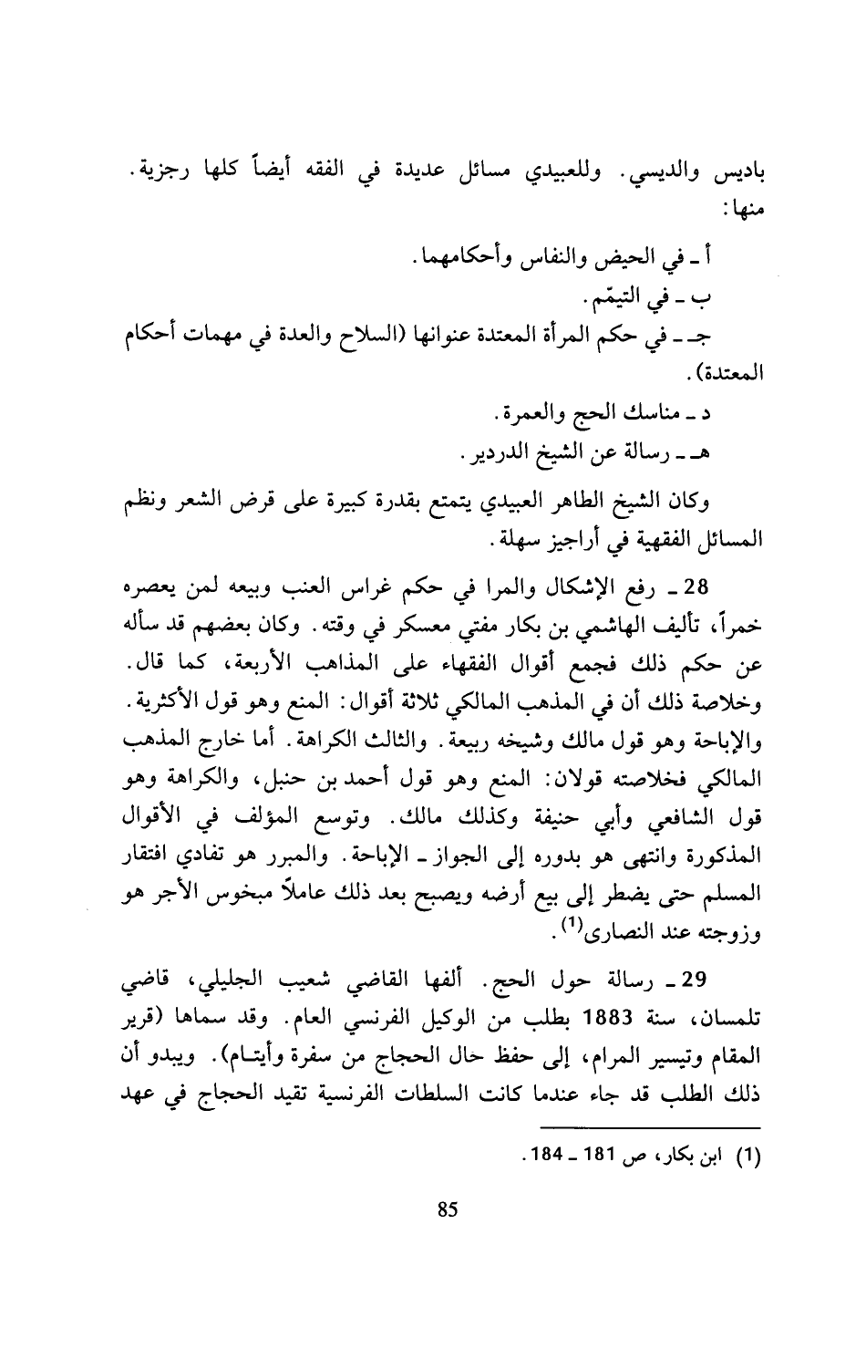 28 - رفع الإشكال والمرا في حكم غراس العنب وبيعه لمن يعصره خمرا، تأليف الهاشمي بن بكار مفتي معسكر في وقته. وكان بعضهم قد سأله عن حكم ذلك فجمع أقوال الفقهاء على المذاهب الأربعة، كما قال. وخلاصة ذلك أن في المذهب المالكي ثلاثة أقوال: المنع وهو قول الأكثرية. والإباحة وهو قول مالك وشيخه ربيعة. والثالث الكراهة. أما خارج المذهب المالكي فخلاصته قولان: المنع وهو قول أحمد بن حنبل، والكراهة وهو قول الشافعي وأبي حنيفة وكذلك مالك. وتوسع المؤلف في الأقوال المذكورة وانتهى هو بدوره إلى الجواز- الإباحة. والمبرر هو تفادي افتقار المسلم حتى يمطر إلى بيع أرضه ويصبح بعد ذلك عاملا مبخوس الأجر هو وزوجته عند النصارى (¬1).