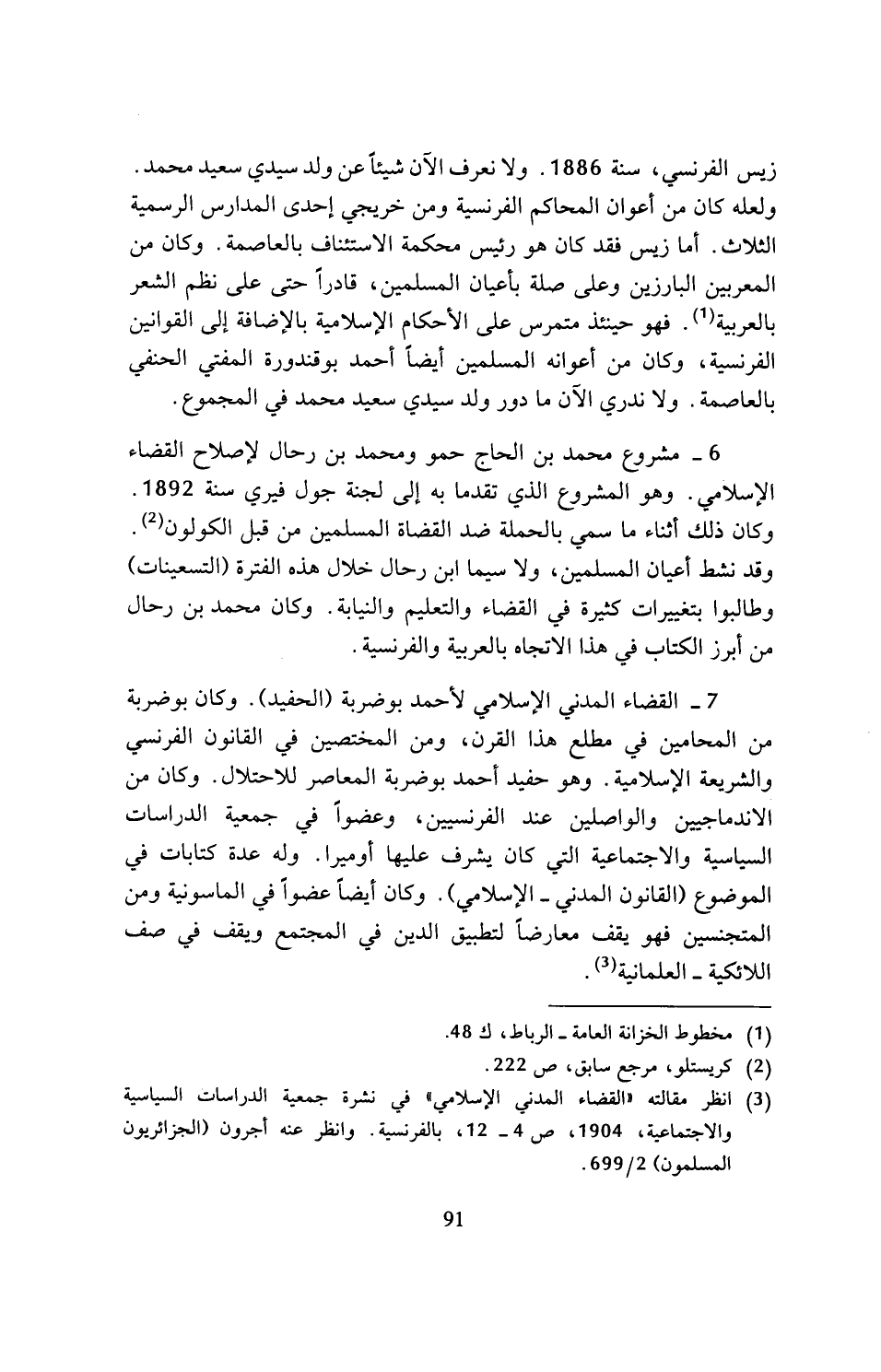 (¬3) انظر مقالته (القضاء المدني الإسلامي) في نشرة جمعية الدراسات السياسية والاجتماعية، 1904، ص 4 - 12، بالفرنسية. وانظر عنه أجرون (الجزائريون المسلمون) 2/ 699.