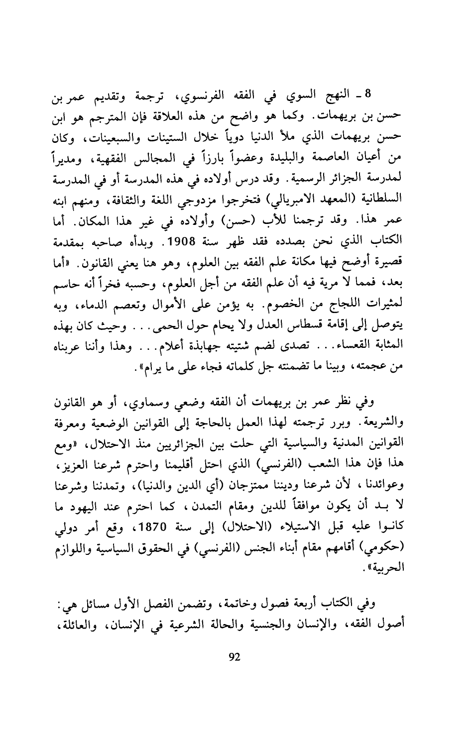 8? النهج السوي في الفقه الفرنسوي، ترجمة وتقديم عمر بن حسن بن بريهمات. وكما هو واضح من هذه العلاقة فإن المترجم هو ابن حسن بريهمات الذي ملا الدنيا دويا خلال الستينات والسبعينات، وكان من أعيان العاصمة والبليدة وعضوا بارزا في المجالس الفقهية، ومديرا لمدرسة الجزائر الرسمية. وقد درس أولاده في هذه المدرسة أو في المدرسة السلطانية (المعهد الامبريالي) فتخرجوا مزدوجي اللغة والثقافة، ومنهم ابنه عمر هذا. وقد ترجمنا للأب (حسن) وأولاده في غير هذا المكان. أما الكتاب الذي نحن بصدده فقد ظهر سنة 1908. وبدأه صاحبه بمقدمة قصيرة أوضح فيها مكانة علم الفقه بين العلوم، وهو هنا يعني القانون. (أما بعد، فمما لا مرية فيه أن علم الفقه من أجل العلوم، وحسبه فخرا أنه حاسم لمثيرات اللجاج من الخصوم. به يؤمن على الأموال وتعصم الدماء، وبه يتوصل إلى إقامة قسطاس العدل ولا يحام حول الحمى ... وحيث كان بهذه المثابة القعساء ... تصدى لضم شتيته جهابذة أعلام ... وهذا وأننا عربناه من عجمته، وبينا ما تضمنته جل كلماته فجاء على ما يرام).