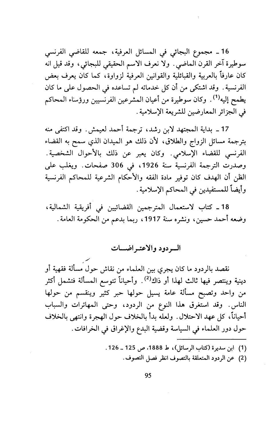 نقصد بالردود ما كان يجري بين العلماء من نقاش حول مسألة فقهية أو دينية وينتصر فيها ثالث لهذا أو ذاك (¬2). وأحيانا تتوسع المسألة فتشمل أكثر من واحد وتصبح مسألة عامة يسيل حولها حبر كثير وينقسم من حولها الناس. وقد استغرق هذا النوع من الردود، وحتى المهاترات والسباب أحيانا، كل عهد الاحتلال. ولعله بدأ بالخلاف حول الهجرة وانتهى بالخلاف حول دور العلماء في السياسة وقضية البدع والإغراق في الخرافات.