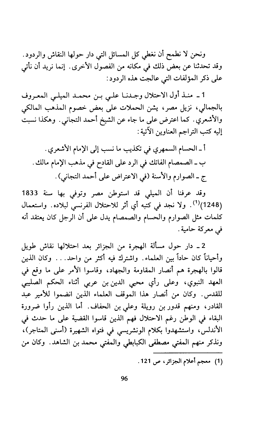 1 - منذ أول الاحتلال وجدنا علي بن محمد الميلي المعروف بالجمالي، نزيل مصر، يشن الحملات على بعض خصوم المذهب المالكي والأشعري. كما اعترض على ما جاء عن الشيخ أحمد التجاني. وهكذا نسبت إليه كتب التراجم العناوين الآتية: