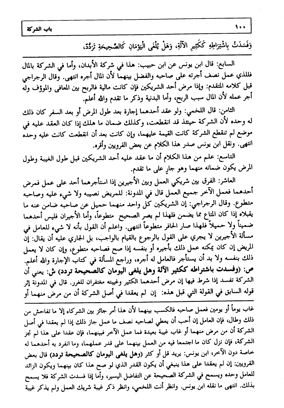 السابع: قال ابن يونس عن ابن حبيب: هذا في شركة الأبدان، وأما في الشركة بالمال فللذي عمل نصف أجرته على صاحبه، والفضل بينهما، لأن المال أجره انتهى. وقال الرجراجي قبل كلامه المتقدم: وإذا مرض أحد الشريكين فإن كانت مالية فالربح بين المعافى والمئوف، وله أجر عمله؛ لأن المال سبب الربح وأما البدنية وذكر ما تقدم، والله أعلم.