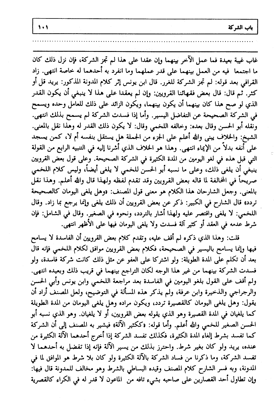 غاب غيبة بعيدة فما عمل الآخر بينهما، وإن عقدا على هذا لم تجز الشركة فإن نزل ذلك كان ما اجتمعا فيه من العمل بينهما على قدر عملهما وما انفرد به أحدهما له خاصة انتهى. زاد القرافي بعد قوله لم تجز الشركة للغرر: قال ابن يونس إثر كلام المدونة المذكور يريد قل، أو كثر ثم قال: قال بعض فقهائنا القرويين، وإن لم يعقدا على هذا لا ينبغي أن يكون القدر الذي لو صح هذا كان بينهما أن يكون بينهما ويكون الزائد على ذلك للعامل وحده، ويسمح في الشركة الصحيحة عن التفاضل اليسير، وأما إذا فسدت الشركة لم يسمح بذلك انتهى. ونقله أبو الحسن، وقال بعده: وخالفه اللخمي، وقال: لا يكون ذلك القدر له، وهذا نقل بالمعنى الشيخ، والخلاف يبنى - والله أعلم - على الجزء من الجملة هل يستقل بنفسه أم لا كمن يسجد على أنفه بدلا من الإيماء انتهى. وهذا هو الخلاف الذي أشرنا إليه في التنبيه الرابع من القولة التي قبل هذه في لغو اليومين من المدة الكثيرة في الشركة الصحيحة وعلى قول بعض القرويين ينبغي أن يلغى ذلك وعلى ما نسبه أبو الحسن للخمي لا يلغى أيضا وليس كلام اللخمي صريحا في المخالفة لما قاله بعض القرويين، وقد تقدم لفظه، ولهذا قال: - والله أعلم - وهذا نقل بالمعنى وجعل الشارحان هذا الكلام هو معنى قول المصنف: "وهل يلغى اليومان كالصحيحة تردد" قال الشارح في الكبير: ذكر عن بعض القرويين أن ذلك يلغى، وإنما يرجع بما زاد، وقال اللخمي لا يلغى، واقتصر عليه، ولهذا أشار بالتردد ونحوه في الصغير، وقال في الشامل فإن شرط عدمه في العقد، أو كثير آلة فسدت، ولا يلغى اليومان فيها على الأظهر انتهى.