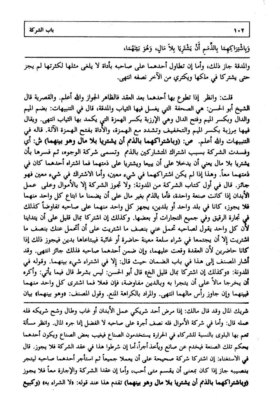 قلت: وانظر إذا تطوع بها أحدهما بعد العقد فالظاهر الجواز، والله أعلم والقصرية قال الشيخ أبو الحسن هي الصحفة التي يغسل فيها الثياب والمدقة قال في التنبيهات بضم الميم والدال وبكسر الميم وفتح الدال وهي الإرزبة بكسر الهمزة التي يكمد بها الثياب انتهى. ويقال فيها مرزبة بكسر الميم والتخفيف وتشدد مع الهمزة والأداة بفتح الهمزة الآلة قاله في التنبيهات، والله أعلم. ص: (وباشتراكهما بالذمم أن يشتريا بلا مال وهو بينهما) ش: أي وفسدت الشركة بسبب اشتراك المتشاركين بالذمم، وتسمى شركة الوجوه ثم فسرها بأن يشتريا بلا مال يعني أن يدخلا على أن يبيعا ويشتريا على ذمتهما فما اشتراه أحدهما كان في ذمتهما معا، وهذا إذا لم يكن اشتراكهما في شيء معين وأما الاشتراك في شيء معين فهو جائز قال في أول كتاب الشركة من المدونة: ولا تجوز الشركة إلا بالأموال وعلى عمل الأبدان إذا كانت صنعة واحدة فأما بالذمم بغير مال على أن يضمنا ما ابتاع كل واحد منهما فلا يجوز كانا في بلد واحد، أو بلدين يجهز كل واحد منهما على صاحبه تفاوضا كذلك في تجارة الرقيق، وفي جميع التجارات، أو بعضها، وكذلك إن اشتركا بمال قليل على أن يتداينا؛ لأن كل واحد يقول لصاحبه: تحمل عني بنصف ما اشتريت على أن أتحمل عنك بنصف ما اشتريت إلا أن يجتمعا في شراء سلعة معينة حاضرة، أو غائبة فيبتاعاها بدين فيجوز ذلك إذا كانا حاضرين؛ لأن العقدة وقعت عليهما، وإن ضمن أحدهما صاحبه فذلك جائز انتهى. وقد أشار المصنف إلى هذا في باب الضمان حيث قال: إلا في اشتراء شيء بينهما وقوله: في المدونة، وكذلك إن اشتركا بمال قليل إلخ قال أبو الحسن ليس بشرط قال فيما يأتي وأكره أن يخرجا مالا على أن يتجرا به وبالدين مفاوضة فإن فعلا فما اشترى كل واحد منهما فبينهما، وإن جاوز رأس مالهما انتهى. والمراد بالكراهة المنع وقول المصنف: "وهو بينهما" بيان