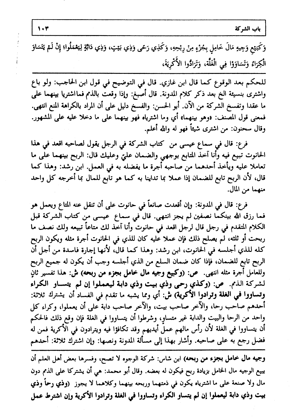 فرع: قال في المدونة: وإن أقعدت صانعا في حانوت على أن تنقل عنه المتاع، ويعمل هو فما رزق الله بينكما نصفين لم يجز انتهى. قال في سماع عيسى من كتاب الشركة قبل الكلام المتقدم في رجل قال لرجل اقعد في حانوت وأنا آخذ لك متاعا تبيعه ولك نصف ما ربحت، أو ثلثه: لم يصلح ذلك فإن عملا عليه كان للذي في الحانوت أجرة مثله، ويكون الربح كله للذي أجلسه في الحانوت ابن رشد، وهذا كما قال؛ لأنها إجارة فاسدة من أجل أن الربح تابع للضمان فإذا كان ضمان السلع من الذي أجلسه وجب أن يكون له جميع الربح وللعامل أجرة مثله انتهى. ص: (وكبيع وجيه مال خامل بجزء من ربحه) ش: هذا تفسير ثان لشركة الذمم. ص: (وكذي رحى وذي بيت وذي دابة ليعملوا إن لم يتساوى الكراء وتساووا في الغلة وترادوا الأكرية) ش: أي، ومما يشبه ما تقدم في الفساد أن يشترك ثلاثة أحدهم صاحب رحى، والآخر صاحب بيت، والآخر صاحب دابة على أن يعملوا وكراء كل واحد من الرحى، والبيت، والدابة غير متساو، وشرطوا أن يتساووا في الغلة، فإن وقع ذلك فالحكم أن يتساووا في الغلة؛ لأن رأس مالهم عمل أيديهم، وقد تكافئوا فيه، ويترادون في الأكرية فمن له فضل رجع به على صاحبه وأشار بهذا إلى مسألة المدونة ونصها وإن اشترك ثلاثة: أحدهم