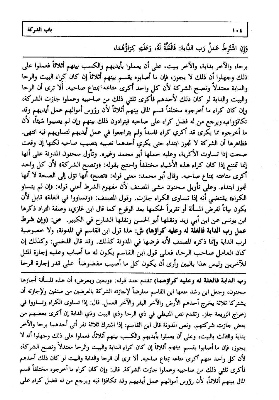 برحا، والآخر بدابة، والآخر ببيت، على أن يعملوا بأيديهم والكسب بينهم أثلاثا فعملوا على ذلك وجهلوا أن ذلك لا يجوز فإن ما أصابوه يقسم بينهم أثلاثا إن كان كراء البيت، والرحى والدابة معتدلا وتصح الشركة؛ لأن كل واحد أكرى متاعه بمتاع صاحبه ألا ترى أن الرحى والبيت والدابة لو كان ذلك لأحدهم فأكرى ثلثي ذلك من صاحبيه وعملوا جازت الشركة، وإن كان كراء ما أخرجوه مختلفا قسم المال بينهم أثلاثا؛ لأن رءوس أموالهم عمل أيديهم، وقد تكافئوا فيه ويرجع من له فضل كراء على صاحبه فيترادون ذلك بينهم، وإن لم يصيبوا شيئا؛ لأن ما أخرجوه مما يكرى قد أكري كراء فاسدا ولم يتراجعوا في عمل أيديهم لتساويهم فيه انتهى. فظاهرها أن الشركة لا تجوز ابتداء حتى يكري أحدهما نصيبه بنصيب صاحبه لكنها إن وقعت صحت إذا تساوت الأكرية وعليه حملها أبو محمد وغيره وتأول سحنون المدونة على أنها إنما تمتنع إذا كان كراء هذه الأشياء مختلفا واحتج بقوله: "وتصح الشركة" لأن كل واحد أكرى متاعه بمتاع صاحبه، وقال أبو محمد: معنى قوله: "تصح" أنها تئول إلى الصحة لا أنها تجوز ابتداء وعلى تأويل سحنون مشى المصنف؛ لأن مفهوم الشرط أعني قوله إن لم يتساو الكراء يقتضي أنه إذا تساوى الكراء جازت وقول المصنف: "وتساووا في الغلة" قابل لأن يكون بيانا لفرض المسألة، أو تقريرا لحكمها بعد الوقوع كما قال ابن غازي وصفة التراد ذكرها ابن يونس عن ابن أبي زيد، ونقلها أبو الحسن ونقلها الشارح في الكبير. ص: (وإن شرط عمل رب الدابة فالغلة له وعليه كراؤها) ش: هذا قول ابن القاسم في المدونة، ولا خصوصية لرب الدابة، وإنما ذكره المصنف؛ لأنه فرضها في المدونة كذلك، وقد قال اللخمي، وكذلك إن كان العامل صاحب الرحى فعلى قول ابن القاسم يكون له ما أصاب وعليه إجارة المثل للآخرين وليس هذا بالبين وأرى أن يكون كل ما أصيب مفضوضا على قدر إجارة الرحا