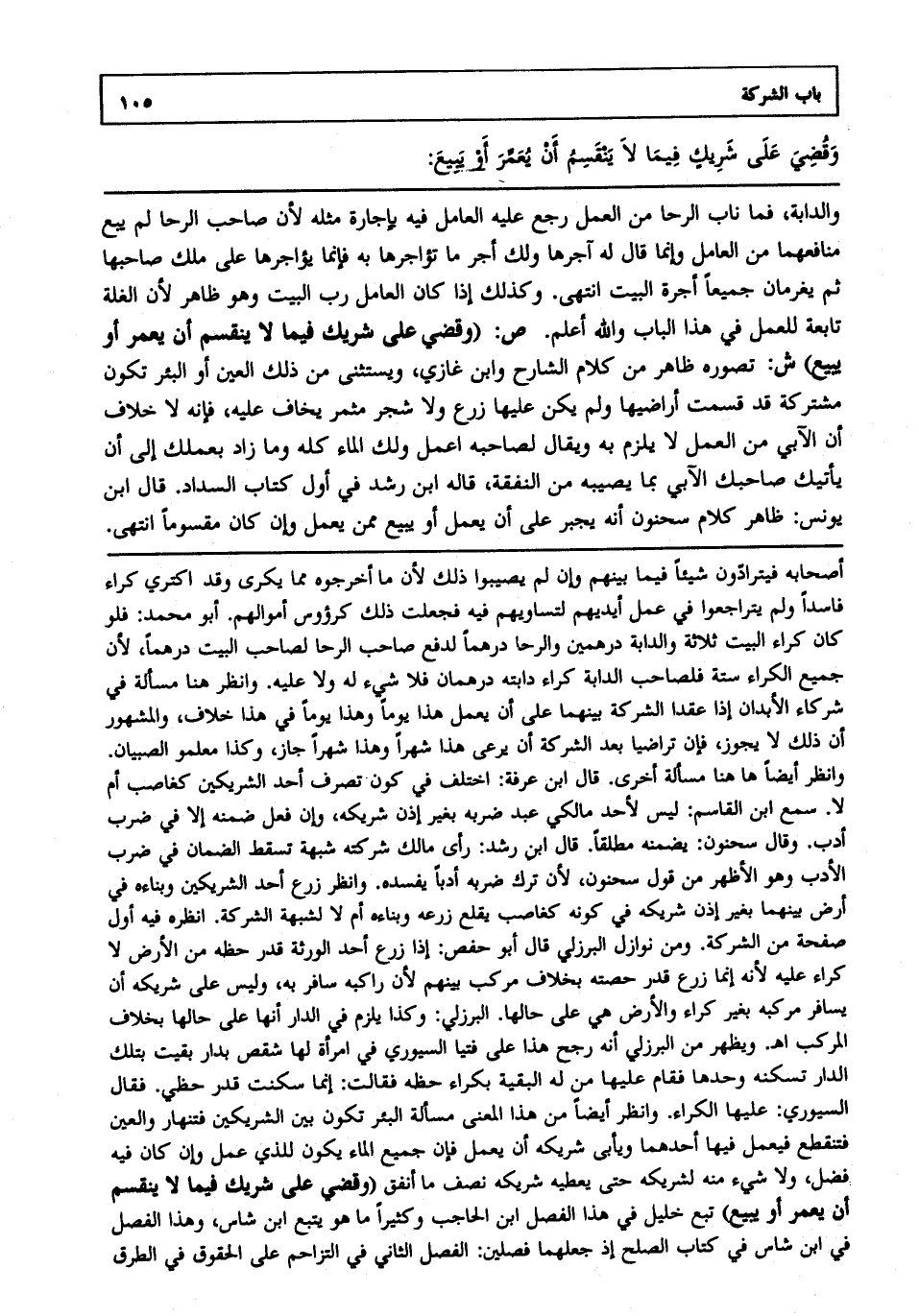 والدابة، فما ناب الرحى من العمل رجع عليه العامل فيه بإجارة مثله؛ لأن صاحب الرحى لم يبع منافعهما من العامل، وإنما قال له آجرها ولك أجر ما تؤاجرها به فإنما يؤاجرها على ملك صاحبها ثم يغرمان جميعا أجرة البيت انتهى. وكذلك إذا كان العامل رب البيت وهو ظاهر؛ لأن الغلة تابعة للعمل في هذا الباب والله أعلم. ص: (وقضي على شريك فيما لا ينقسم أن يعمر، أو يباع) ش: تصوره ظاهر من كلام الشارح وابن غازي ويستثنى من ذلك العين، أو البئر تكون مشتركة قد قسمت أراضيها ولم يكن عليها زرع، ولا شجر مثمر يخاف عليه فإنه لا خلاف أن الآبي من العمل لا يلزم به ويقال لصاحبه: اعمل ولك الماء كله وما زاد بعملك إلى أن يأتيك صاحبك الآبي بما يصيبه من النفقة قاله ابن رشد في أول كتاب السداد قال ابن يونس ظاهر كلام سحنون أنه يجبر على أن يعمل، أو يبيع ممن يعمل، وإن كان مقسوما انتهى.