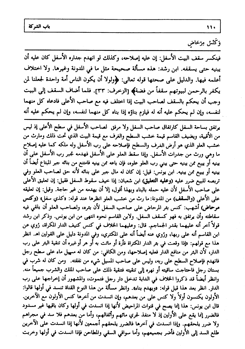 فينكسر سقف البيت الأسفل: إن عليه إصلاحه، وكذلك لو انهدم جداره الأسفل كان عليه أن يبنيه حتى يسقفه ابن رشد هذه مسألة صحيحة مثل ما في المدونة وغيرها، ولا اختلاف أعلمه فيها، والدليل على صحتها قوله تعالى: {وَلَوْلا أَنْ يَكُونَ النَّاسُ أُمَّةً وَاحِدَةً لَجَعَلْنَا لِمَنْ يَكْفُرُ بِالرَّحْمَنِ لِبُيُوتِهِمْ سُقُفاً مِنْ فِضَّةٍ} [الزخرف: 33] فلما أضاف السقف إلى البيت وجب أن يحكم بالسقف لصاحب البيت إذا اختلف فيه مع صاحب الأعلى فادعاه كل منهما لنفسه، وإن لم يحكم عليه أنه له فيلزم بناؤه إذا بناه كل منهما لنفسه، وإن لم يحكم عليه أنه