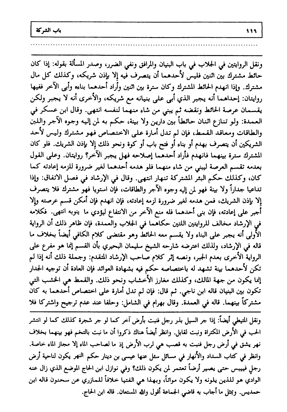 ونقل الروايتين في الجلاب في باب البنيان والمرافق ونفى الضرر وصدر المسألة بقوله: إذا كان حائط مشترك بين اثنين فليس لأحدهما أن يتصرف فيه إلا بإذن شريكه، وكذلك كل مال مشترك وإذا انهدم الحائط المشترك وكان سترة بين اثنين، وأراد أحدهما بناءه وأبى الآخر ففيها روايتان إحداهما أنه يجبر الذي أبى على بنيانه مع شريكه، والأخرى أنه لا يجبر ولكن يقسمان عرصة الحائط ونقضه ثم يبني من شاء منهما لنفسه انتهى. وقال ابن عسكر في العمدة، ولو تنازع اثنان حائطا بين دارين، ولا بينة حكم به لمن إليه وجوه الآجر واللبن والطاقات ومعاقد القمط فإن لم تدل أمارة على الاختصاص فهو مشترك وليس لأحد الشريكين أن يتصرف بهدم، أو بناء، أو فتح باب، أو كوة ونحو ذلك إلا بإذن الشريك فلو كان المشترك سترة بينهما فانهدم فأراد أحدهما إصلاحه فهل يجبر الآخر روايتان وعلى القول بعدمه تقسم العرصة ليبني من شاء منهما فلو هدمه أحدهما لغير ضرورة للزمه إعادته كما كان، وكذلك حكم البئر المشتركة تنهار انتهى. وقال في الإرشاد في فصل الاتفاق: وإذا تداعيا جدارا، ولا بينة فهو لمن إليه وجوه الآجر، والطاقات فإن استويا فهو مشترك فلا يتصرف إلا بإذن الشريك، فمن هدمه لغير ضرورة لزمه إعادته فإن انهدم فإن أمكن قسم عرصته وإلا أجبر على إعادته فإن بنى أحدهما فله منع الآخر من الانتفاع ليؤدي ما ينوبه انتهى. فكلامه في الإرشاد مخالف للروايتين اللتين حكاهما في الجلاب والعمدة فإن ظاهر ذلك أن الرواية الأولى أنه يجبر على البناء، ولا يقسم معه الحائط وهو مقتضى كلام الكافي أيضا بخلاف ما قاله في الإرشاد؛ ولذلك اعترضه شارحه الشيخ سليمان البحيري بأن القسم إنما هو مفرع على الرواية الأخرى بعدم الجبر، ونصه إثر كلام صاحب الإرشاد المتقدم، وجملة ذلك أنه إذا لم تكن لأحدهما بينة تشهد له باختصاصه حكم فيه بشهادة العوائد فإن العادة أن توجيه الجدار إنما يكون من جهة المالك، وكذلك مغارز الأخشاب ونحو ذلك والقمط هي الخشب التي تكون بين البنيان قاله ابن ناجي. ثم قال: فإن لم تدل أمارة على اختصاص أحدهما به كان مشتركا بينهما قاله في العمدة، وقال بهرام في الشامل: وحلفا عند عدم ترجيح واشتركا فلا