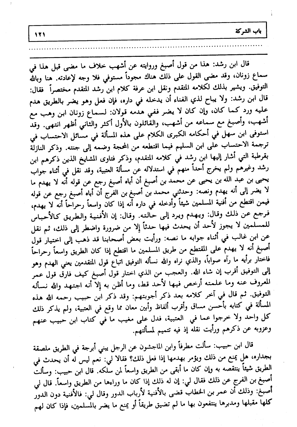 قال ابن رشد: هذا من قول أصبغ وروايته عن أشهب خلاف ما مضى قبل هذا في سماع زونان، وقد مضى القول على ذلك هناك مجودا مستوفى فلا وجه لإعادته هنا، وبالله التوفيق. ويشير بذلك لكلامه المتقدم، ونقل ابن عرفة كلام ابن رشد المتقدم مختصرا فقال: قال ابن رشد: ولا يباح لذي الفناء أن يدخله في داره فإن فعل وهو يضر بالطريق هدم عليه ورد كما كان، وإن كان لا يضر ففي هدمه قولان: لسماع زونان ابن وهب مع أشهب وأصبغ مع سماعه من أشهب، والقائلون بالأول أكثر، والثاني أظهر انتهى. وقد استوفى ابن سهل في أحكامه الكبرى الكلام على هذه المسألة في مسائل الاحتساب في ترجمة الاحتساب على ابن السليم فيما اقتطعه من المحجة وضمه إلى جنته وذكر النازلة بقرطبة التي أشار إليها ابن رشد في كلامه المتقدم، وذكر فتاوى المشايخ الذين ذكرهم ابن رشد وغيرهم ولم يخرج أحد منهم في استدلاله عن مسألة العتبية، وقد نقل في أثناء جواب يحيى بن عبد الله بن يحيى عن محمد بن أصبغ أن أباه أصبغ رجع عن قوله أنه لا يهدم ما لا يضر إلى أنه يهدم. ونصه: وحدثني محمد بن أصبغ بن الفرج أن أباه أصبغ رجع عن قوله فيمن اقتطع من أفنية المسلمين شيئا، وأدخله في داره أنه إذا كان واسعا رحراحا أنه لا يهدم فرجع عن ذلك، وقال: ويهدم ويرد إلى حالته، وقال: إن الأفنية، والطريق كالأحباس للمسلمين لا يجوز لأحد أن يحدث فيها حدثا إلا من ضرورة، واضطر إلى ذلك ثم نقل عن ابن غالب في أثناء جوابه ما نصه: ورأيت بعض أصحابنا قد ذهب إلى اختيار قول أصبغ: إنه لا يهدم على المقتطع من طريق المسلمين ما اقتطع إذا كان الطريق واسعا رحراحا فاختار برأيه ما رآه صوابا. والذي نراه، والله نسأله التوفيق اتباع قول المتقدمين يعني الهدم وهو إلى التوفيق أقرب إن شاء الله، والعجب من الذي اختار قول أصبغ كيف فارق قول عمر المعروف عنه وما علمته أرخص فيها لأحد قط وما أظن به إلا أنه اجتهد، والله نسأله التوفيق ثم قال في آخر كلامه بعد ذكر أجوبتهم: وقد ذكر ابن حبيب رحمه الله هذه المسألة في كتابه بأحسن مساق وأقرب ألفاظ وأبين معان مما وقع في العتبية، ولم يذكر ذلك كل واحد، ولا خرجوا عما في العتبية فدل على مغيب ما في كتاب ابن حبيب عنهم وعزوبه عن ذكرهم ورأيت نقله إذ فيه تتميم لمسألتهم.