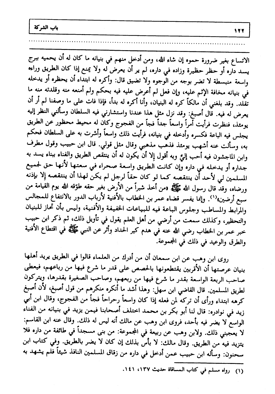 روى ابن وهب عن ابن سمعان أن من أدرك من العلماء قالوا في الطريق يريد أهلها بنيان عرصتها أن الأقربين يقتطعونها بالحصص على قدر ما شرع فيها من رباعهم فيعطى صاحب الربعة الواسعة بقدر ما شرع فيها من رباعهم وصاحب الصغيرة بقدرها ويتركون لطريق المسلمين قال القاضي ابن سهل: وهذا أشد ما أنكره منكرهم من قول أصبغ، لأن أصبغ كرهه ابتداء ورأى أن تركه لمن فعله إذا كان واسعا رحراحا فجا من الفجاج، وقال ابن أبي زيد في نوادره: قال لنا أبو بكر بن محمد اختلف أصحابنا فيمن يزيد في بنيانه من الفناء الواسع لا يضر فيه بأحد فروى ابن وهب عن مالك أنه ليس له ذلك، وقال عنه ابن القاسم لا يعجبني ذلك ولابن وهب عن ربيعة في المجموعة من بنى مسجدا في طائفة من داره فلا يتزيد فيه من الطريق، وقال مالك: لا بأس بذلك إن كان لا يضر بالطريق وفي كتاب ابن سحنون وسأله ابن حبيب عمن أدخل في داره من زقاق المسلمين النافذ شيئا فلم يشهد به