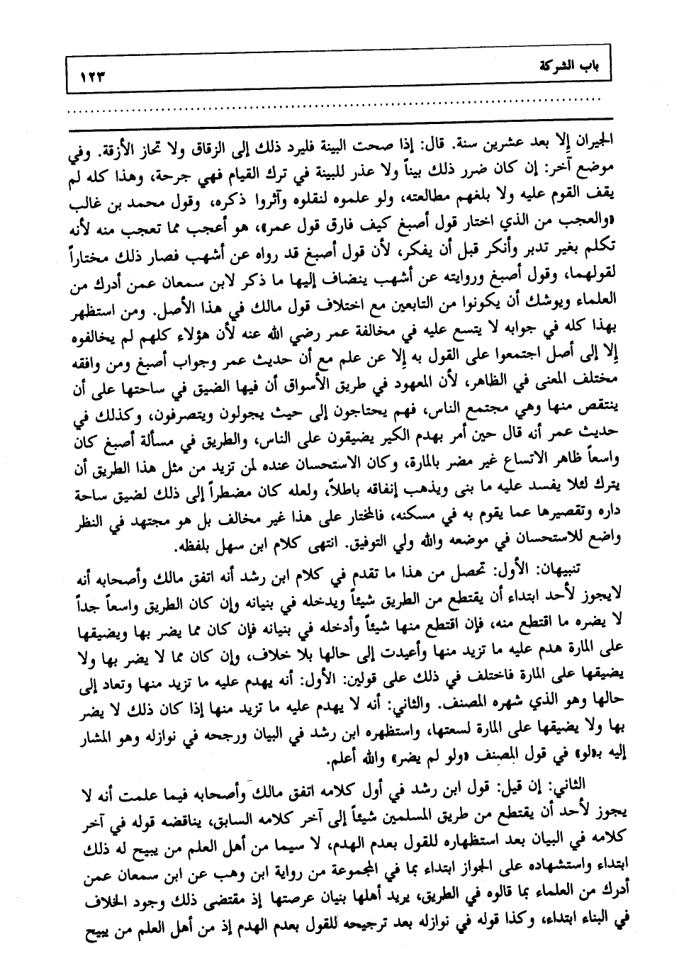 الثاني: إن قيل: قول ابن رشد في أول كلامه اتفق مالك وأصحابه فيما علمت أنه لا يجوز لأحد أن يقتطع من طريق المسلمين شيئا إلى آخر كلامه السابق يناقضه قوله في آخر كلامه في البيان بعد استظهاره للقول بعدم الهدم لا سيما من أهل العلم من يبيح