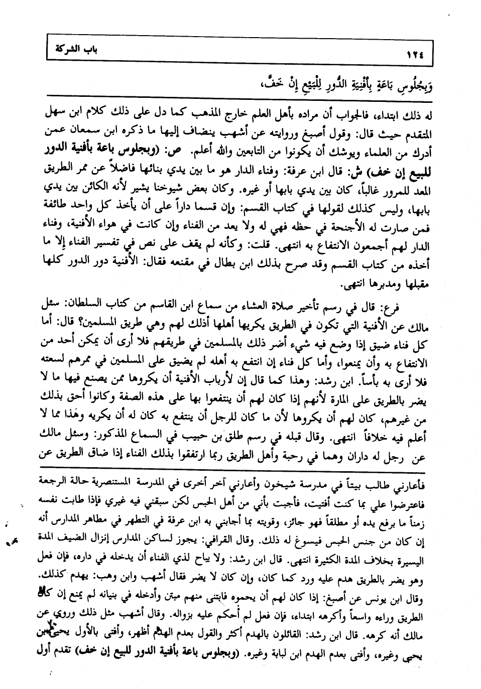 له ذلك ابتداء، واستشهاده على الجواز ابتداء بما في المجموعة من رواية ابن وهب عن ابن سمعان عمن أدرك من العلماء بما قالوه في الطريق يريد أهلها بنيان عرصتها إذ مقتضى ذلك وجود الخلاف في البناء ابتداء، وكذا قوله في نوازله بعد ترجيحه للقول بعدم الهدم إذ من أهل العلم من يبيح له ذلك ابتداء فالجواب أن مراده بأهل العلم خارج المذهب كما دل على ذلك كلام ابن سهل المتقدم حيث قال: وقول أصبغ وروايته عن أشهب ينضاف إليها ما ذكره ابن سمعان عمن أدرك من العلماء ويوشك أن يكونوا من التابعين، والله أعلم. ص: (وبجلوس باعة بأفنية الدور للبيع إن خف) ش: قال ابن عرفة: وفناء الدار هو ما بين يدي بنائها فاضلا عن ممر الطريق المعد للمرور غالبا كان بين يدي بابها، أو غيره وكان بعض شيوخنا يشير لأنه الكائن بين يدي بابها وليس كذلك لقولها في كتاب القسم: وإن قسما دارا على أن يأخذ كل واحد طائفة فمن صارت له الأجنحة في حظه فهي له، ولا يعد من الفناء، وإن كانت في هواء الأفنية وفناء الدار لهم أجمعين الانتفاع بها انتهى. قلت: وكأنه لم يقف على نص في تفسير الفناء إلا ما أخذه من كتاب القسم، وقد صرح بذلك ابن بطال في مقنعه فقال: الأفنية دور الدور كلها مقبلها ومدبرها انتهى.