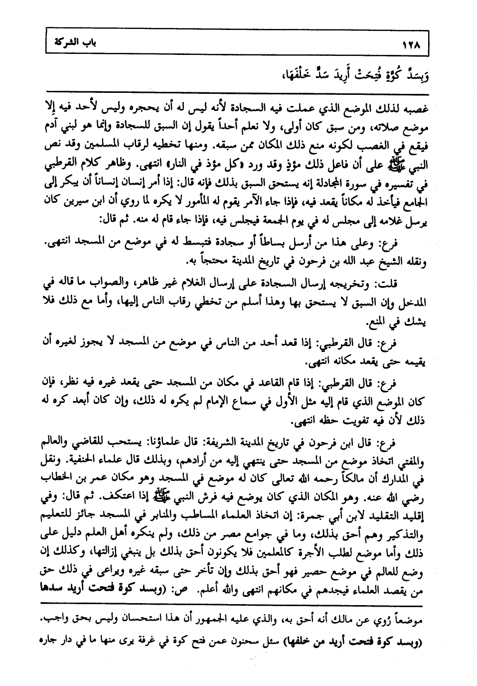 فرع: وعلى هذا من أرسل بساطا، أو سجادة فتبسط له في موضع من المسجد انتهى. ونقله الشيخ عبد الله بن فرحون في تاريخ المدينة محتجا به