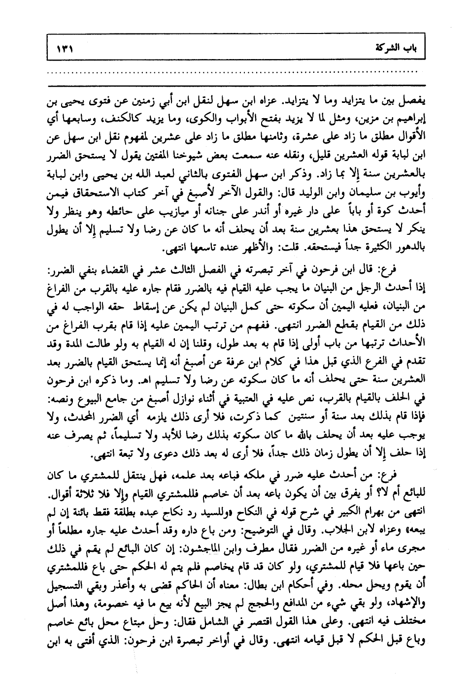فرع: قال ابن فرحون في آخر تبصرته في الفصل الثالث عشر في القضاء بنفي الضرر: إذا أحدث الرجل من البنيان ما يجب عليه القيام فيه بالضرر فقام جاره عليه بالقرب من الفراغ من البنيان فعليه اليمين أن سكوته حتى كمل البنيان لم يكن عن إسقاط حقه الواجب له في ذلك من القيام بقطع الضرر انتهى. ففهم من ترتب اليمين عليه إذا قام بقرب الفراغ من الأحداث ترتبها من باب، أولى إذا قام به بعد طول وقلنا: إن له القيام به، ولو طالت المدة، وقد تقدم في الفرع الذي قبل هذا في كلام ابن عرفة عن أصبغ أنه إنما يستحق القيام بالضرر بعد العشرين سنة حتى يحلف أنه ما كان سكوته عن رضا، ولا تسليم ا هـ. وما ذكره ابن فرحون في الحلف بالقيام بالقرب نص عليه في العتبية في أثناء نوازل أصبغ من جامع البيوع ونصه فإذا قام بذلك بعد سنة، أو سنتين كما ذكرت فلا أرى ذلك يلزمه أي الضرر المحدث، ولا يوجب عليه بعد أن يحلف بالله ما كان سكوته بذلك رضا للأبد، ولا تسليما ثم يصرف عنه إذا حلف إلا أن يطول زمان ذلك جدا فلا أرى له بعد ذلك دعوى، ولا تبعة انتهى.