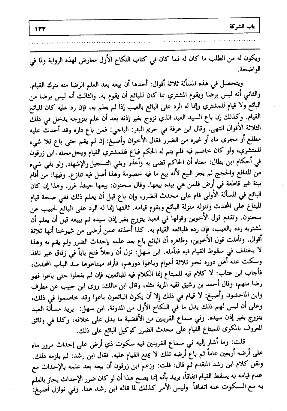 قلت: وما أشار إليه في سماع القرينين فيه سكوت ذي أرض على إحداث مرور ماء على أرضه أربعين عاما ثم باع أرضه تلك لا يمنع القيام عليه فقال ابن رشد: لم يلزمه ذلك، ونقل كلام ابن رشد المتقدم ثم قال: قلت: وزعم ابن زرقون أن بيعه بعد علمه بالإحداث مع عدم قيامه به يسقط القيام اتفاقا يريد بأنه إنما يصح هذا أن لو كان ضرر الإحداث يحاز بالعلم به مع السكوت عنه اتفاقا وليس الأمر كذلك لما قاله ابن رشد هنا وفي نوازل أصبغ:
