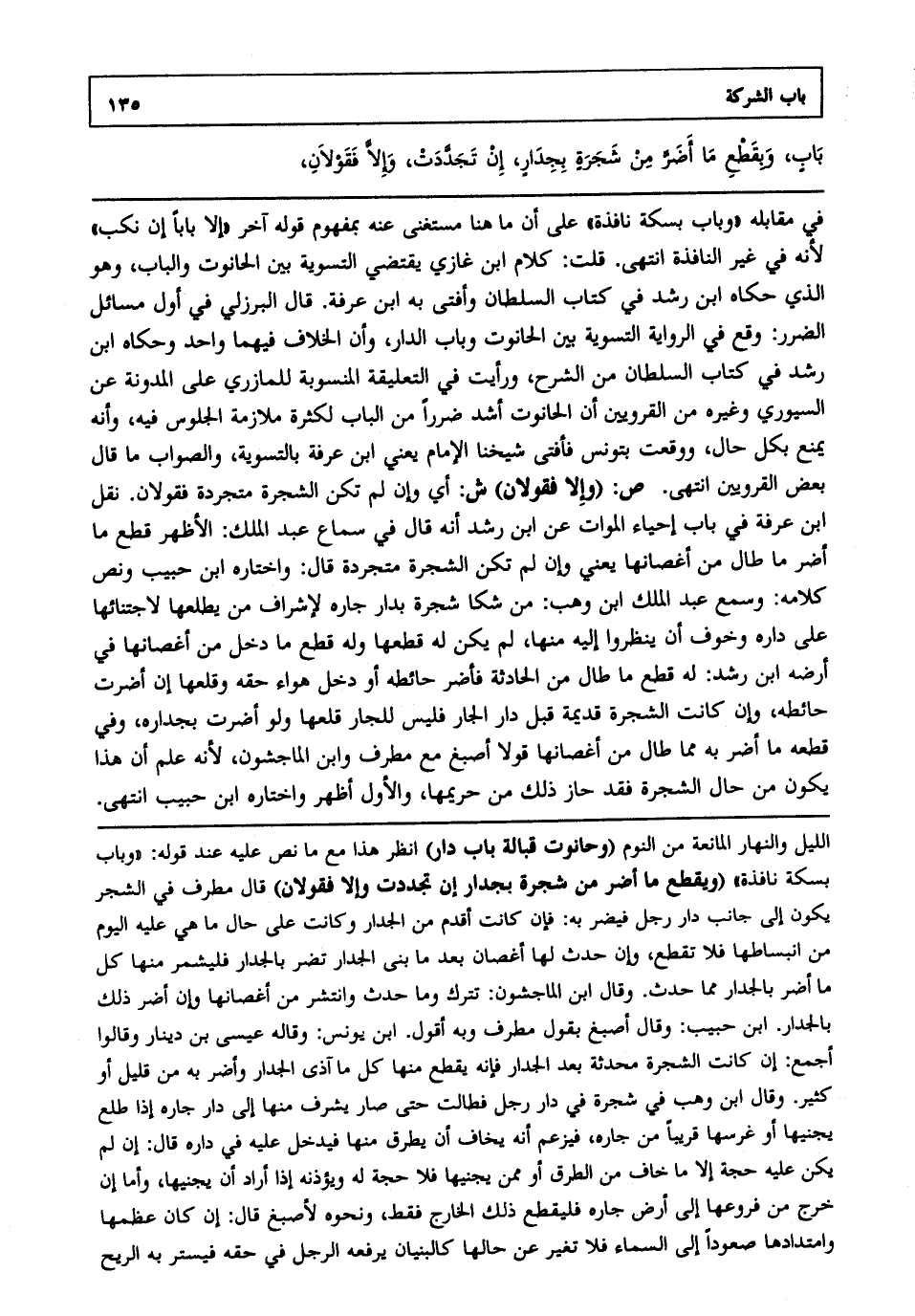 في مقابله: "وباب بسكة نافذة" على أن ما هنا مستغنى عنه بمفهوم قوله آخرا "إلا بابا أن نكب" لأنه في غير النافذة انتهى. قلت: كلام ابن غازي يقتضي التسوية بين الحانوت والباب وهو الذي حكاه ابن رشد في كتاب السلطان وأفتى به ابن عرفة قال البرزلي في أول مسائل الضرر: وقع في الرواية التسوية بين الحانوت وباب الدار، وأن الخلاف فيهما واحد وحكاه ابن رشد في كتاب السلطان من الشرح ورأيت في التعليقة المنسوبة للمازري على المدونة عن السيوري، وغيره من القرويين أن الحانوت أشد ضررا من الباب لكثرة ملازمة الجلوس فيه، وأنه يمنع بكل حال ووقعت بتونس فأفتى شيخنا الإمام يعني ابن عرفة بالتسوية، والصواب ما قال بعض القرويين انتهى. ص: (وإلا فقولان) ش: أي، وإن لم تكن الشجرة متجردة فقولان. نقل ابن عرفة في باب إحياء الموات عن ابن رشد أنه قال في سماع عبد الملك الأظهر قطع ما أضر ما طال من أغصانها يعني وإن لم تكن الشجرة متجردة قال واختاره ابن حبيب ونص كلامه: وسمع عبد الملك ابن وهب من شكا شجرة بدار جاره لإشراف من يطلعها لاجتنائها على داره وخوف أن ينظروا إليه منها لم يكن له قطعها، وله قطع ما دخل من أغصانها في أرضه ابن رشد له قطع ما طال من الحادثة فأضر حائطه، أو دخل هواء حقه وقلعها إن أضرت حائطه، وإن كانت الشجرة قديمة قبل دار الجار فليس للجار قلعها، ولو أضرت بجداره، وفي قطعه ما أضر به مما طال من أغصانها قولا أصبغ مع مطرف وابن الماجشون؛ لأنه علم أن هذا يكون من حال الشجرة فقد حاز ذلك من حريمها، والأول أظهر، واختاره ابن حبيب انتهى.