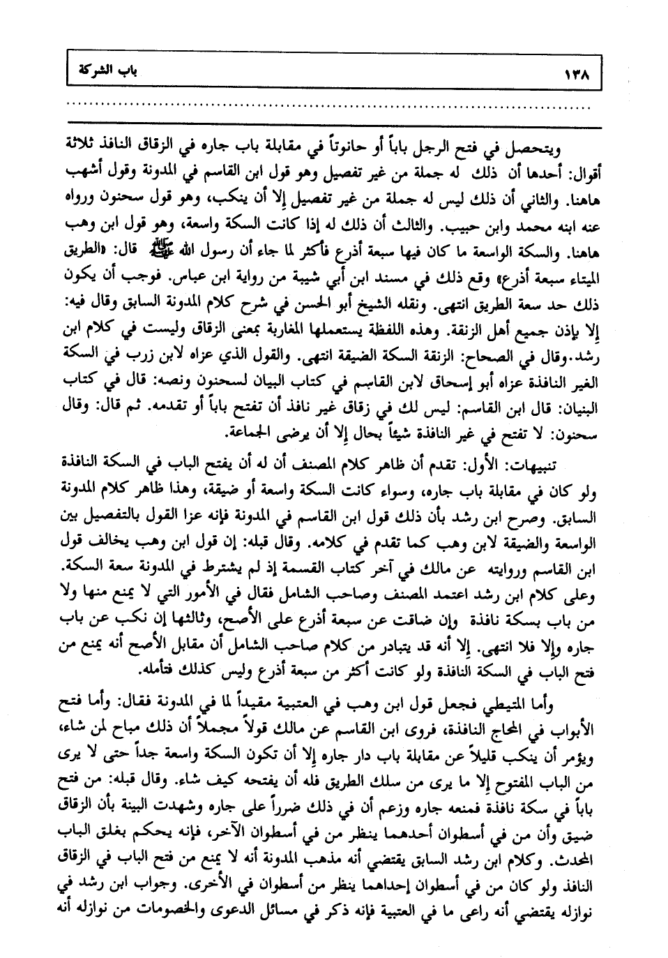 ويتحصل في فتح الرجل بابا، أو حانوتا في مقابلة باب جاره في الزقاق النافذ ثلاثة أقوال أحدها أن ذلك له جملة من غير تفصيل وهو قول ابن القاسم في المدونة، وقول أشهب ههنا، والثاني أن ذلك ليس له جملة من غير تفصيل إلا أن ينكب وهو قول سحنون ورواه عنه ابنه محمد وابن حبيب، والثالث أن ذلك له إذا كانت السكة واسعة وهو قول ابن وهب ههنا، والسكة الواسعة ما كان فيها سبعة أذرع فأكثر لما جاء أن رسول الله صلى الله عليه وسلم قال: "الطريق الميتاء سبعة أذرع" وقع ذلك في مسند ابن أبي شيبة من رواية ابن عباس فوجب أن يكون ذلك حد سعة الطريق انتهى. ونقله الشيخ أبو الحسن في شرح كلام المدونة السابق، وقال فيه: إلا بإذن جميع أهل الزنقة وهذه اللفظة يستعملها المغاربة بمعنى الزقاق وليست في كلام ابن رشد، وقال في الصحاح الزنقة السكة الضيقة انتهى. والقول الذي عزاه لابن زرب في السكة الغير النافذة عزاه أبو إسحاق لابن القاسم في كتاب البنيان لسحنون ونصه: قال في كتاب البنيان: قال ابن القاسم: ليس لك في زقاق غير نافذ أن تفتح بابا، أو تقدمه ثم قال: وقال سحنون لا تفتح في غير النافذة شيئا بحال إلا أن يرضى الجماعة.