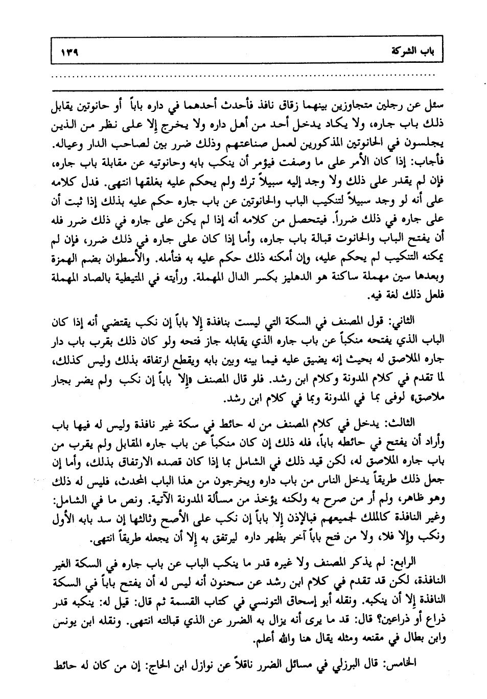 الخامس: قال البرزلي في مسائل الضرر ناقلا عن نوازل ابن الحاج: إن من كان له حائط