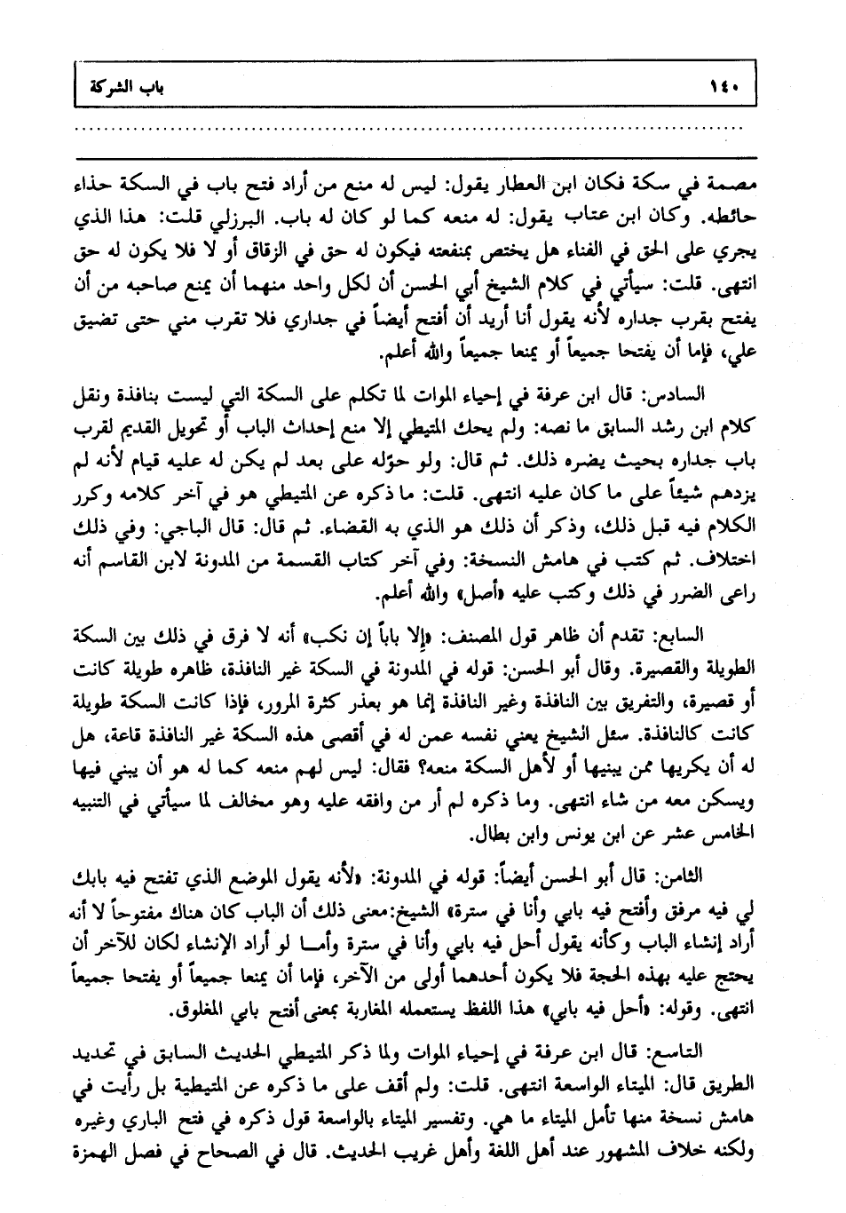 السادس: قال ابن عرفة في إحياء الموات لما تكلم على السكة التي ليست بنافذة ونقل كلام ابن رشد السابق ما نصه: ولم يحك المتيطي إلا منع إحداث الباب، أو تحويل القديم لقرب باب جداره بحيث يضره ذلك ثم قال: ولو حوله على بعد لم يكن له عليه قيام؛ لأنه لم يزدهم شيئا على ما كان عليه انتهى. قلت: ما ذكره عن المتيطي هو في آخر كلامه وكرر الكلام فيه قبل ذلك وذكر أن ذلك هو الذي به القضاء ثم قال: قال الباجي وفي ذلك اختلاف ثم كتب في هامش النسخة وفي آخر كتاب القسمة من المدونة لابن القاسم أنه راعى الضرر في ذلك وكتب عليه "أصل" والله أعلم.