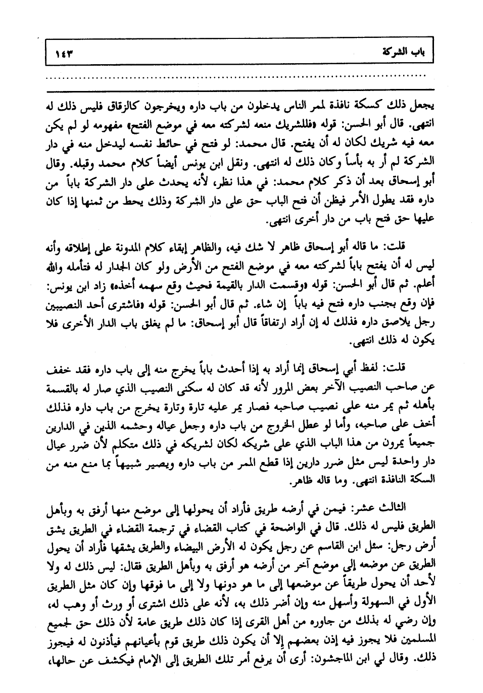 يجعل ذلك كسكة نافذة لممر الناس يدخلون من باب داره ويخرجون كالزقاق فليس ذلك له انتهى. قال أبو الحسن: قوله "فللشريك منعه لشركته معه في موضع الفتح" مفهومه لو لم يكن معه فيه شريك لكان له أن يفتح قال محمد: لو فتح في حائط نفسه ليدخل منه في دار الشركة لم أر به بأسا، وكان ذلك له انتهى. ونقل ابن يونس أيضا كلام محمد: وقبله، وقال أبو إسحاق بعد أن ذكر كلام محمد في هذا نظر؛ لأنه يحدث على دار الشركة بابا من داره فقد يطول الأمر فيظن أن فتح الباب حق على دار الشركة وذلك يحط من ثمنها إذا كان عليها حق فتح باب من دار أخرى انتهى.