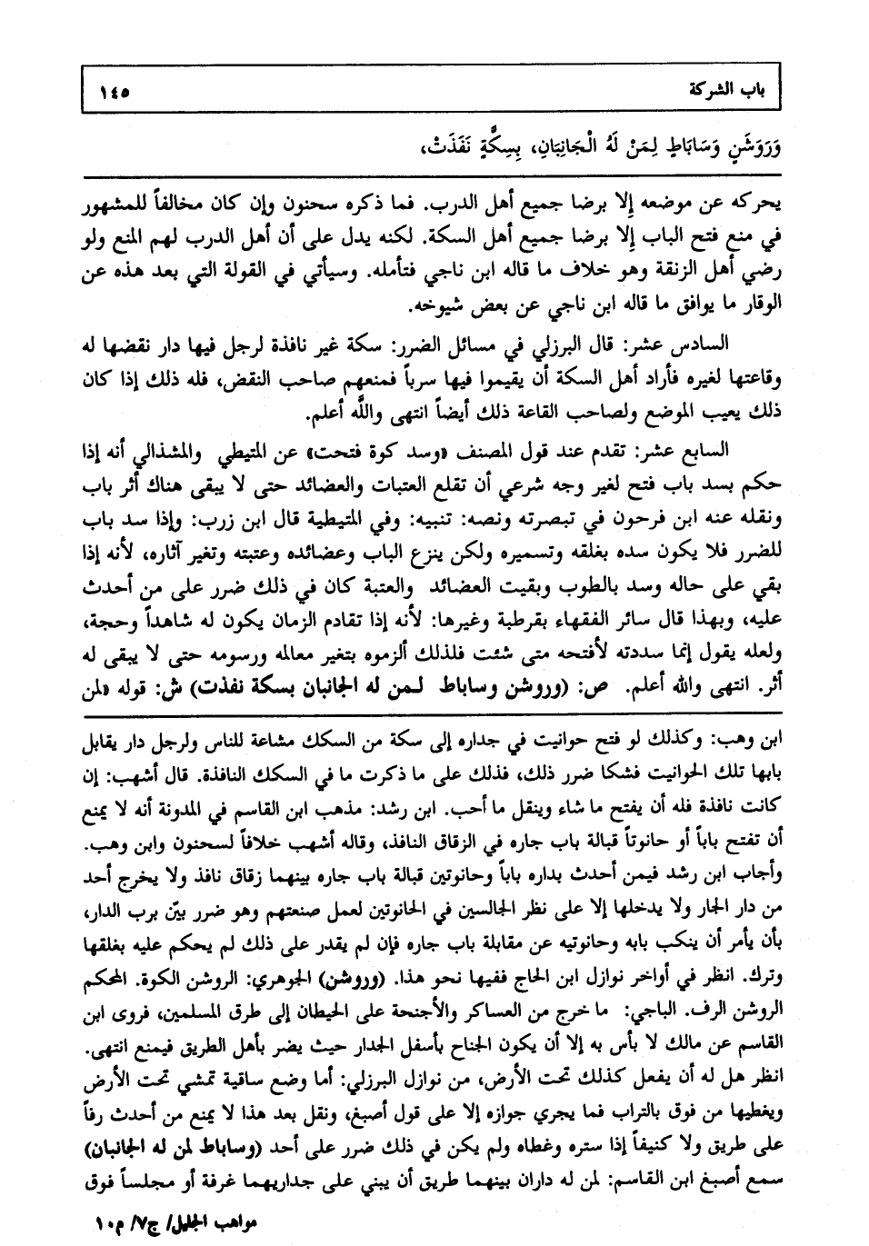 السابع عشر: تقدم عند قول المصنف: "وسد كوة فتحت" عن المتيطي والمشذالي أنه إذا حكم بسد باب فتح لغير وجه شرعي أن تقلع العتبات، والعضائد حتى لا يبقى هناك أثر باب ونقله عنه ابن فرحون في تبصرته ونصه: تنبيه: وفي المتيطية قال ابن زرب: وإذا سد باب للضرر فلا يكون سده بغلقه، وتسميره ولكن ينزع الباب، وعضائده وعتبته وتغير آثاره؛ لأنه إذا بقي على حاله وسد بالطوب، وبقيت العضائد، والعتبة كان في ذلك ضرر على من أحدث عليه وبهذا قال سائر الفقهاء بقرطبة، وغيرها: لأنه إذا تقادم الزمان يكون له شاهدا وحجة ولعله يقول إنما سددته لأفتحه متى شئت فلذلك ألزموه بتغير معالمه ورسومه حتى لا يبقى له أثر انتهى، والله أعلم. ص: (وروشن وساباط لمن له الجانبان بسكة نفذت) ش: قوله: "لمن