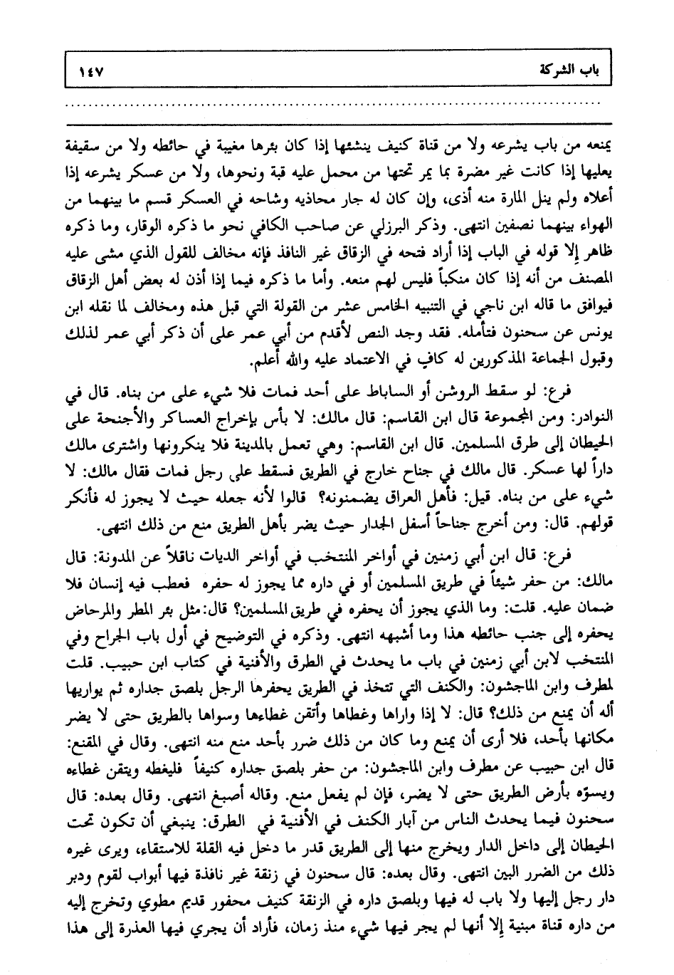يمنعه من باب يشرعه، ولا من قناة كنيف ينشئها إذا كان بئرها مغيبة في حائطه، ولا من سقيفة يعليها إذا كانت غير مضرة بما يمر تحتها من محمل عليه قبة ونحوها، ولا من عسكر يشرعه إذا أعلاه ولم ينل المارة منه أذى، وإن كان له جار محاذيه وشاحه في العسكر قسم ما بينهما من الهواء بينهما نصفين انتهى. وذكر البرزلي عن صاحب الكافي نحو ما ذكره الوقار وما ذكره ظاهر إلا قوله في الباب إذا أراد فتحه في الزقاق غير النافذ، فإنه مخالف للقول الذي مشى عليه المصنف من أنه إذا كان منكبا فليس لهم منعه وأما ما ذكره فيما إذا أذن له بعض أهل الزقاق فيوافق ما قاله ابن ناجي في التنبيه الخامس عشر من القولة التي قبل هذه، ومخالف لما نقله ابن يونس عن سحنون، فتأمله فقد وجد النص لأقدم من أبي عمر على أن ذكر أبي عمر لذلك وقبول الجماعة المذكورين له كاف في الاعتماد عليه، والله أعلم.