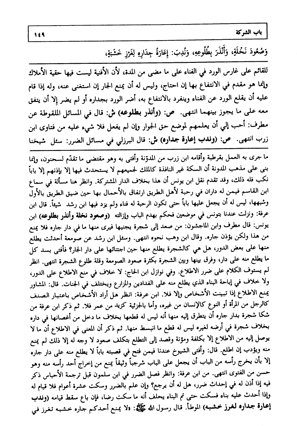وصعود نخلة، وأنذر بطلوعه، وندب: إعارة جداره لغرز خشبة،
