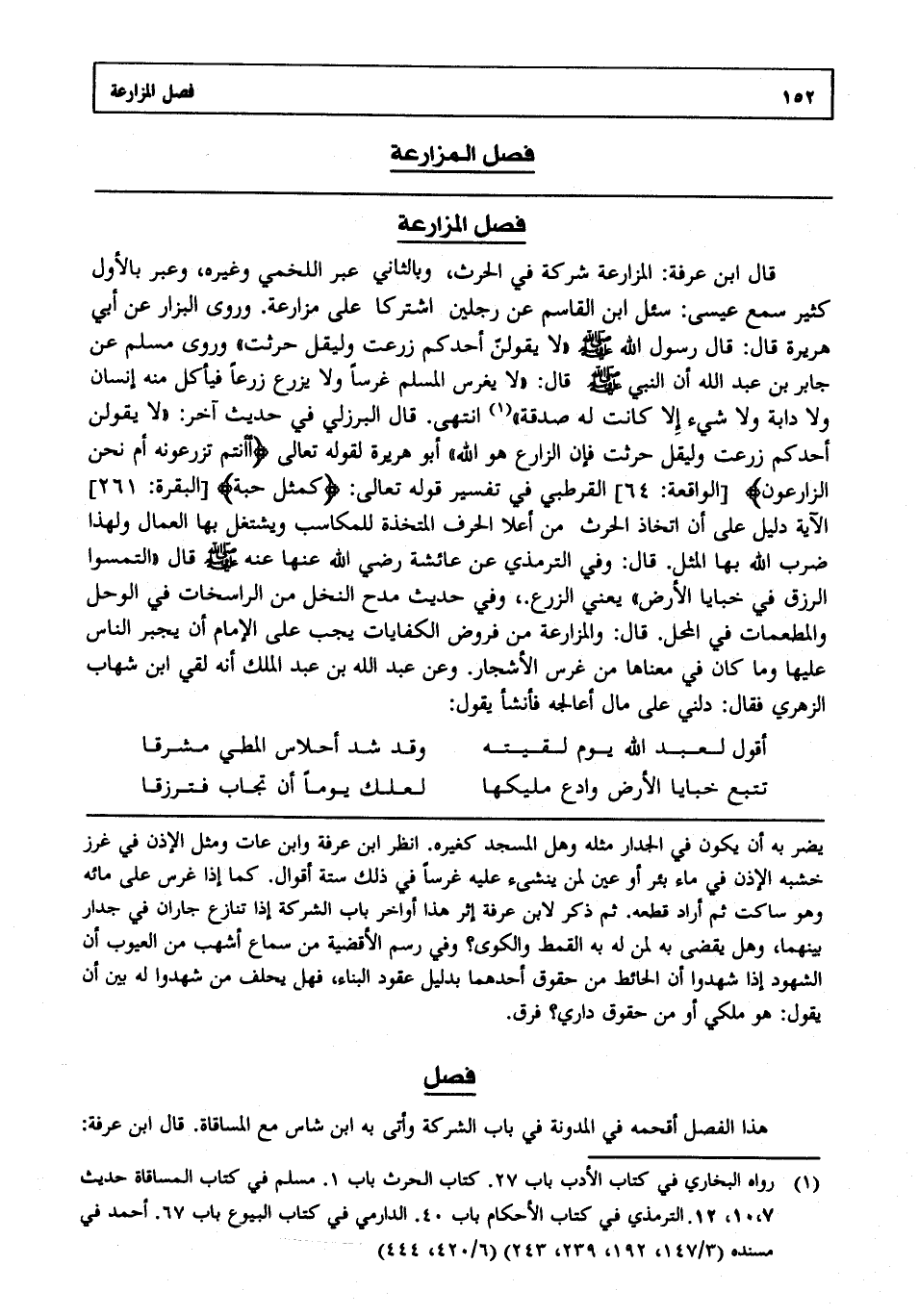 قال ابن عرفة: المزارعة شركة في الحرث وبالثاني عبر اللخمي، وغيره وعبر بالأول كثير، سمع عيسى سئل ابن القاسم عن رجلين اشتركا على مزارعة وروى البزار عن أبي هريرة قال: قال رسول الله صلى الله عليه وسلم: "لا يقولن أحدكم زرعت وليقل حرثت" وروى مسلم عن جابر بن عبد الله أن النبي صلى الله عليه وسلم قال: "لا يغرس المسلم غرسا، ولا يزرع زرعا فيأكل منه إنسان، ولا دابة، ولا شيء إلا كانت له صدقة" 1 انتهى. قال البرزلي في حديث آخر: "لا يقولن أحدكم زرعت، وليقل حرثت فإن الزارع هو الله" أبو هريرة لقوله تعالى: {أَأَنْتُمْ تَزْرَعُونَهُ أَمْ نَحْنُ الزَّارِعُونَ} [الواقعة: 64] القرطبي في تفسير قوله تعالى: {كَمَثَلِ حَبَّةٍ} [البقرة: 261] الآية دليل على أن اتخاذ الحرث من أعلى الحرف المتخذة للمكاسب ويشتغل بها العمال، ولهذا ضرب الله بها المثل قال: وفي الترمذي عن عائشة رضي الله عنها عنه صلى الله عليه وسلم قال: "التمسوا الرزق في خبايا الأرض" يعني الزرع وفي حديث مدح النخل من الراسخات في الوحل والمطعمات في المحل قال: والمزارعة من فروض الكفايات يجب على الإمام أن يجبر الناس عليها، وما كان في معناها من غرس الأشجار وعن عبد الله بن عبد الملك أنه لقي ابن شهاب الزهري فقال: دلني على مال أعالجه فأنشأ يقول: