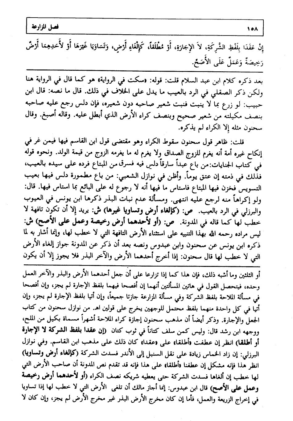 قلت: ظاهر قول سحنون سقوط الكراء وهو مقتضى قول ابن القاسم فيها فيمن غر في إنكاح غيره أمة أنه يغرم للزوج الصداق، ولا يغرم له ما يغرمه الزوج من قيمة الولد ونحوه قوله في كتاب الجنايات من باع عبدا سارقا دلس فيه فسرق من المبتاع فرده على سيده بالعيب فذلك في ذمته إن عتق يوما وأظن في نوازل الشعبي من باع مطمورة دلس فيها بعيب التسويس فخزن فيها المبتاع فاستاس ما فيها أنه لا رجوع له على البائع بما استاس فيها قال، ولو أكراها منه لرجع عليه انتهى. ومسألة عدم نبات البذر ذكرها ابن يونس في العيوب والبرزلي في الرد بالعيب. ص: (كإلغاء أرض وتساويا غيرها) ش: يريد إلا أن تكون تافهة لا خطب لها كما قاله في المدونة. ص: (أو لأحدهما أرض رخيصة وعمل على الأصح) ش: ليس مراده رحمه الله بهذا التنبيه على استثناء الأرض التافهة التي لا خطب لها، وإنما أشار به لما ذكره ابن يونس عن سحنون وابن عبدوس ونصه بعد أن ذكر عن المدونة جواز إلغاء الأرض التي لا خطب لها: قال سحنون إذا أخرج أحدهما الأرض والآخر البذر فلا يجوز إلا أن يكون
