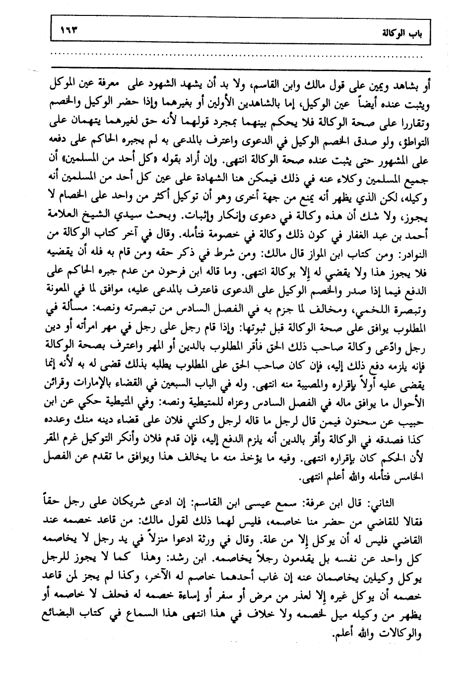 الثاني: قال ابن عرفة: سمع عيسى ابن القاسم: إن ادعى شريكان على رجل حقا فقالا للقاضي من حضر منا خاصمه فليس لهما ذلك لقول مالك: من قاعد خصمه عند القاضي، فليس له أن يوكل إلا من علة وقال في ورثة ادعوا منزلا في يد رجل لا يخاصمه كل واحد عن نفسه بل يقدمون رجلا يخاصمه ابن رشد: وهذا كما لا يجوز للرجل يوكل وكيلين يخاصمان عنه إن غاب أحدهما خاصم له الآخر وكذا لم يجز لمن قاعد خصمه أن يوكل غيره إلا لعذر من مرض أو سفر أو إساءة خصمه له، فحلف لا خاصمه أو يظهر من وكيله ميل لخصمه ولا خلاف في هذا انتهى هذا السماع في كتاب البضائع والوكالات والله أعلم.