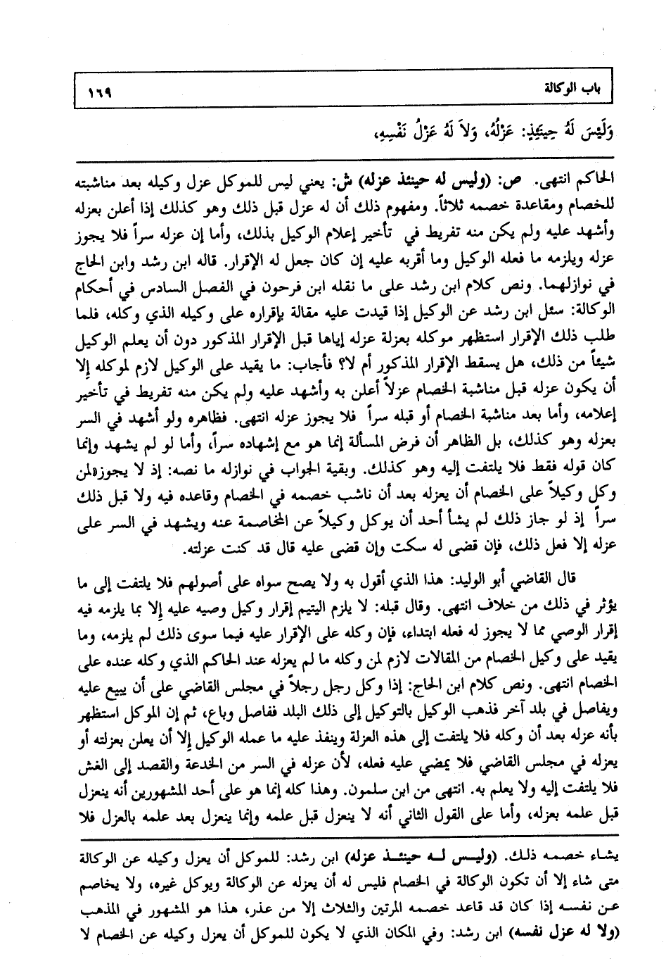 الحاكم انتهى. ص: (وليس له حينئذ عزله) ش: يعني ليس للموكل عزل وكيله بعد مناشبته للخصام ومقاعدة خصمه ثلاثا ومفهوم ذلك أن له عزله قبل ذلك، وهو كذلك إذا أعلن بعزله، وأشهد عليه ولم يكن منه تفريط في تأخير إعلام الوكيل بذلك، وأما إن عزله سرا فلا يجوز عزله، ويلزمه ما فعله الوكيل وما أقر به عليه إن كان جعل له الإقرار قاله ابن رشد وابن الحاج في نوازلهما ونص كلام ابن رشد على ما نقله ابن فرحون في الفصل السادس في أحكام الوكالة سئل ابن رشد عن الوكيل إذا قيدت عليه مقالة بإقراره على وكيله الذي وكله فلما طلب ذلك الإقرار استظهر موكله بعزلة عزله إياها قبل الإقرار المذكور دون أن يعلم الوكيل شيئا من ذلك هل يسقط الإقرار المذكور أم لا؟ فأجاب: ما يقيد على الوكيل لازم لموكله إلا أن يكون عزله قبل مناشبة الخصام عزلا أعلن به وأشهد عليه، ولم يكن منه تفريط في تأخير إعلامه، وأما بعد مناشبة الخصام أو قبله سرا فلا يجوز عزله انتهى. فظاهره ولو أشهد في السر بعزله، وهو كذلك بل الظاهر أن فرض المسألة إنما هو مع إشهاده سرا، وأما لو لم يشهد، وإنما كان قوله فقط فلا يلتفت إليه، وهو كذلك وبقية الجواب في نوازله ما نصه: إذ لا يجوز لمن وكل وكيلا على الخصام أن يعزله بعد أن ناشب خصمه في الخصام وقاعده فيه ولا قبل ذلك سرا إذ لو جاز ذلك لم يشأ أحد أن يوكل وكيلا عن المخاصمة عنه ويشهد في السر على عزله إلا فعل ذلك فإن قضى له سكت وإن قضى عليه قال: قد كنت عزلته