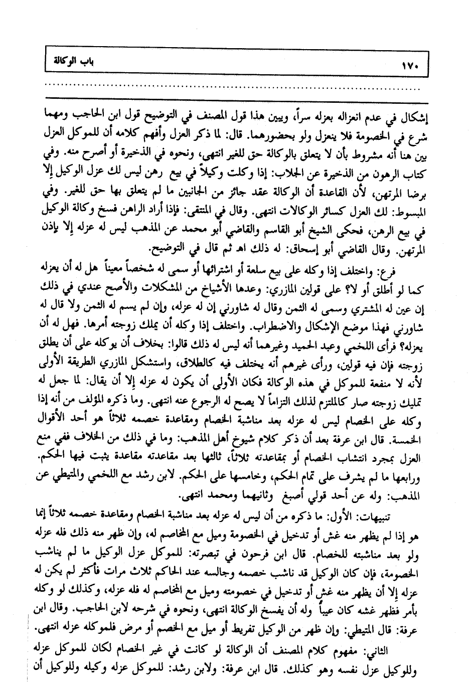 إشكال في عدم انعزاله بعزله سرا ويبين هذا قول المصنف في التوضيح قول ابن الحاجب ومهما شرع في الخصومة فلا ينعزل ولو بحضورهما قال لما ذكر العزل وأفهم كلامه أن للموكل العزل بين هنا أنه مشروط بأن لا يتعلق بالوكالة حق للغير انتهى. ونحوه في الذخيرة أو أصرح منه وفي كتاب الرهون من الذخيرة عن الجلاب إذا وكلت وكيلا في بيع رهن ليس لك عزل الوكيل إلا برضا المرتهن؛ لأن القاعدة أن الوكالة عقد جائز من الجانبين ما لم يتعلق بها حق للغير، وفي المبسوط لك العزل كسائر الوكالات انتهى. وقال في المنتقى فإذا أراد الراهن فسخ وكالة الوكيل في بيع الرهن فحكى الشيخ أبو القاسم والقاضي أبو محمد عن المذهب ليس له عزله إلا بإذن المرتهن وقال القاضي أبو إسحاق: له ذلك ا هـ. ثم قال في التوضيح: