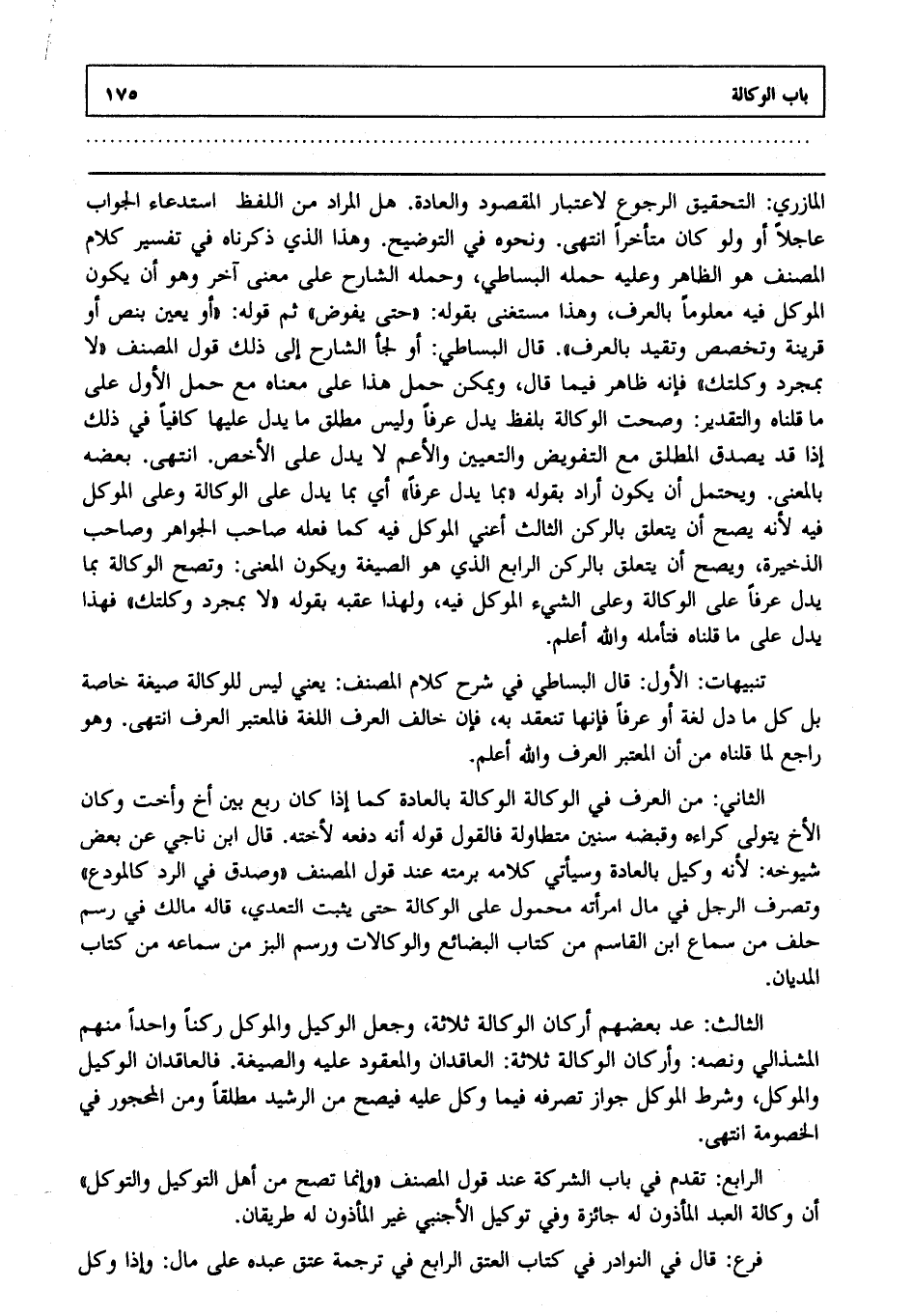 المازري التحقيق الرجوع لاعتبار المقصود والعادة هل المراد من اللفظ استدعاء الجواب عاجلا؟ أو ولو كان متأخرا؟ انتهى ونحوه في التوضيح، وهذا الذي ذكرناه في تفسير كلام المصنف هو الظاهر وعليه حمله البساطي وحمله الشارح على معنى آخر، وهو أن يكون الموكل فيه معلوما بالعرف، وهذا مستغنى بقوله: "حتى يفوض" ثم قوله: "أو يعين بنص أو قرينة وتخصص وتقيد بالعرف". قال البساطي: وألجأ الشارح إلى ذلك قول المصنف: "لا بمجرد وكلتك" فإنه ظاهر فيما قال ويمكن حمل هذا على معناه مع حمل الأول على ما قلناه والتقدير: وصحت الوكالة بلفظ يدل عرفا وليس مطلق ما يدل عليها كافيا في ذلك إذ قد يصدق المطلق مع التفويض والتعيين والأعم لا يدل على الأخص انتهى. بعضه بالمعنى. ويحتمل أن يكون أراد بقوله: "بما يدل عرفا" أي بما يدل على الوكالة وعلى الموكل فيه؛ لأنه يصح أن يتعلق بالركن الثالث أعني الموكل فيه كما فعله صاحب الجواهر وصاحب الذخيرة ويصح أن يتعلق بالركن الرابع الذي هو الصيغة، ويكون المعنى: وتصح الوكالة بما يدل عرفا على الوكالة وعلى الشيء الموكل فيه، ولهذا عقبه بقوله: "لا بمجرد وكلتك" فهذا يدل على ما قلناه فتأمله والله أعلم.