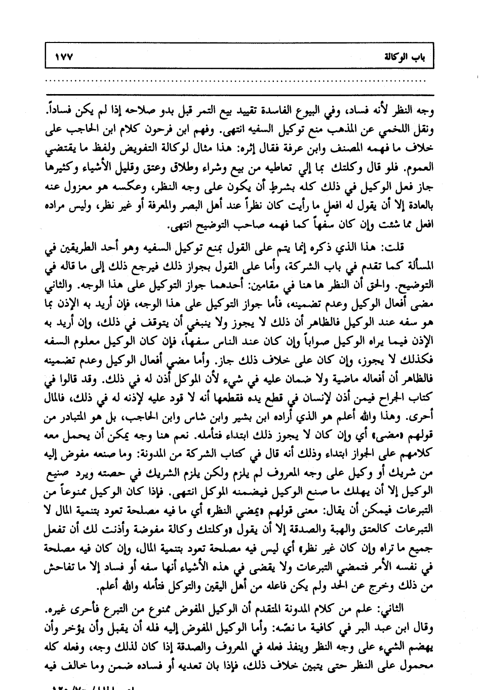 قلت: هذا الذي ذكره إنما يتم على القول بمنع توكيل السفيه، وهو أحد الطريقين في المسألة كما تقدم في باب الشركة، وأما على القول بجواز ذلك، فيرجع ذلك إلى ما قاله في التوضيح والحق أن النظر ههنا في مقامين أحدهما جواز التوكيل على هذا الوجه والثاني: مضي أفعال الوكيل وعدم تضمينه، فأما جواز التوكيل على هذا الوجه، فإن أريد به الإذن بما هو سفه عند الوكيل، فالظاهر أن ذلك لا يجوز، ولا ينبغي أن يتوقف في ذلك وإن أريد به الإذن فيما يراه الوكيل صوابا وإن كان عند الناس سفها فإن كان الوكيل معلوم السفه، فكذلك لا يجوز وإن كان على خلاف ذلك جاز، وأما مضي أفعال الوكيل، وعدم تضمينه فالظاهر أن أفعاله ماضية ولا ضمان عليه في شيء؛ لأن الموكل أذن له في ذلك، وقد قالوا في كتاب الجراح فيمن أذن لإنسان في قطع يده فقطعها أنه: لا قود عليه لإذنه له في ذلك، فالمال أحرى، وهذا والله أعلم. هو الذي أراده ابن بشير وابن شاس وابن الحاجب بل هو المتبادر من قولهم مضى أي وإن كان لا يجوز ذلك ابتداء، فتأمله نعم هنا وجه يمكن أن يحمل معه كلامهم على الجواز ابتداء، وذلك أنه قال في كتاب الشركة من المدونة: وما صنعه مفوض إليه من شريك أو وكيل على وجه المعروف لم يلزم، ولكن يلزم الشريك في حصته ويرد صنيع الوكيل إلا أن يهلك ما صنع الوكيل، فيضمنه الموكل انتهى. فإذا كان الوكيل ممنوعا من التبرعات فيمكن أن يقال معنى قولهم: "يمضي النظر" أي ما فيه مصلحة تعود بتنمية المال لا التبرعات كالعتق والهبة والصدقة إلا أن يقول: "وكلتك وكالة مفوضة وأذنت لك أن تفعل جميع ما تراه، وإن كان غير نظر" أي ليس فيه مصلحة تعود بتنمية المال، وإن كان فيه مصلحة في نفس الأمر فتمضي التبرعات ولا يقضى في هذه الأشياء أنها سفه أو فساد إلا ما تفاحش من ذلك وخرج عن الحد ولم يكن فاعله من أهل اليقين والتوكل فتأمله والله أعلم.