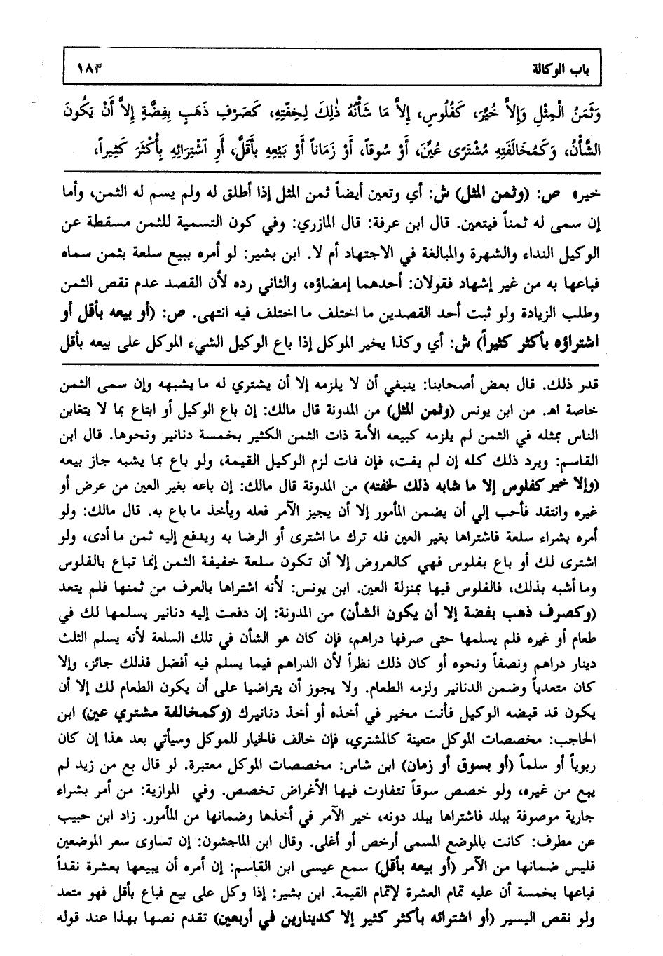 خير". ص: (وثمن المثل) ش: أي وتعين أيضا ثمن المثل إذا أطلق له، ولم يسم له الثمن، وأما إن سمى له ثمنا، فيتعين، قال ابن عرفة قال المازري: وفي كون التسمية للثمن مسقطة عن الوكيل النداء والشهرة والمبالغة في الاجتهاد أم لا ابن بشير لو أمره ببيع سلعة بثمن سماه، فباعها به من غير إشهاد فقولان: أحدهما: إمضاؤه والثاني: رده؛ لأن القصد عدم نقص الثمن وطلب الزيادة، ولو ثبت أحد القصدين ما اختلف فيه انتهى. ص: (أو بيعه بأقل أو اشتراؤه بأكثر كثيرا) ش: أي، وكذا يخير الموكل إذا باع الوكيل الشيء الموكل على بيعه بأقل