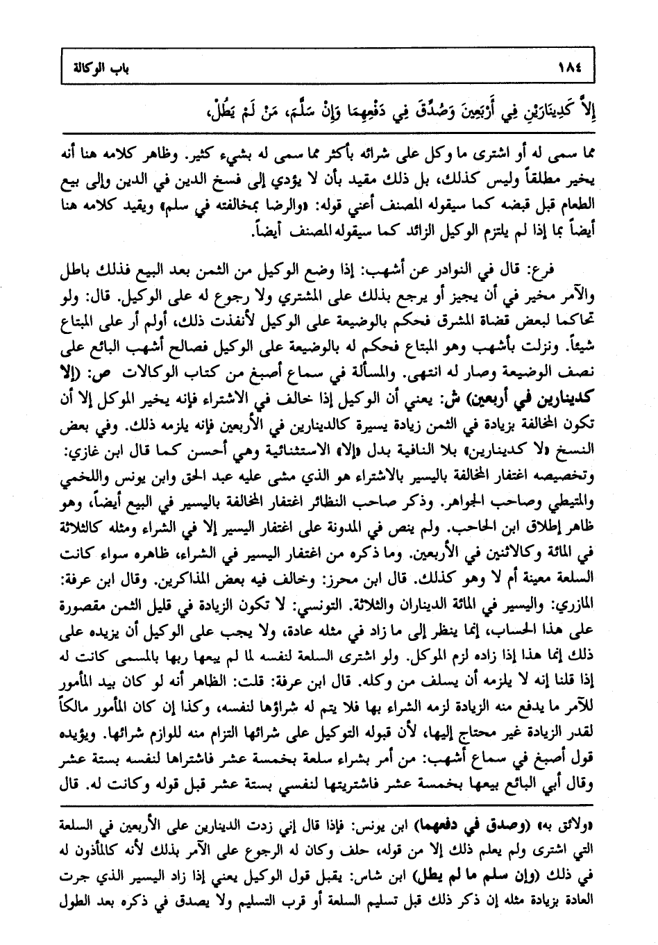فرع: قال في النوادر عن أشهب: إذا وضع الوكيل من الثمن بعد البيع، فذلك باطل، والآمر مخير في أن يجيز أو يرجع بذلك على المشتري ولا رجوع له على الوكيل قال: ولو تحاكما لبعض قضاة المشرق فحكم بالوضيعة على الوكيل لأنفذت ذلك ولم أر على المبتاع شيئا ونزلت بأشهب وهو المبتاع فحكم له بالوضيعة على الوكيل فصالح أشهب البائع على نصف الوضيعة وصار له انتهى والمسألة في سماع أصبغ من كتاب الوكالات. ص: (إلا كدينارين في أربعين) ش: يعني أن الوكيل إذا خالف في الاشتراء فإنه يخير الموكل إلا أن تكون المخالفة بزيادة في الثمن زيادة يسيرة كالدينارين في الأربعين، فإنه يلزمه ذلك وفي بعض النسخ "لا كدينارين" بلا النافية بدل "إلا" الاستثنائية وهي أحسن كما قال ابن غازي وتخصيصه اغتفار المخالفة باليسير بالاشتراء هو الذي مشى عليه عبد الحق وابن يونس واللخمي والمتيطي وصاحب الجواهر وذكر صاحب النظائر اغتفار المخالفة باليسير في البيع أيضا، وهو ظاهر إطلاق ابن الحاجب ولم ينص في المدونة على اغتفار اليسير إلا في الشراء ومثله كالثلاثة في المائة، وكالاثنين في الأربعين، وما ذكره من اغتفار اليسير في الشراء ظاهره سواء كانت السلعة معينة أم لا وهو كذلك قال ابن محرز: وخالف فيه بعض المذاكرين وقال ابن عرفة المازري: واليسير في المائة الديناران والثلاثة التونسي لا تكون الزيادة في قليل الثمن مقصورة على هذا الحساب إنما ينظر إلى ما زاد في مثله عادة، ولا يجب على الوكيل أن يزيده على ذلك إنما هذا إذا زاده لزم الموكل، ولو اشترى السلعة لنفسه لما لم يبعها ربها بالمسمى كانت له إذا قلنا إنه لا يلزمه أن يسلف من وكله قال ابن عرفة: قلت: الظاهر أنه لو كان بيد المأمور للآمر ما يدفع منه الزيادة لزمه الشراء بها فلا يتم له شراؤها لنفسه، وكذا إن كان المأمور مالكا لقدر الزيادة غير محتاج إليها؛ لأن قبوله التوكيل على شرائها التزام منه للوازم شرائها ويؤيده قول أصبغ في سماع أشهب من أمر بشراء سلعة بخمسة عشر فاشتراها لنفسه بستة عشر، وقال أبى البائع بيعها بخمسة عشر فاشتريتها لنفسي بستة عشر قبل قوله وكانت له قال