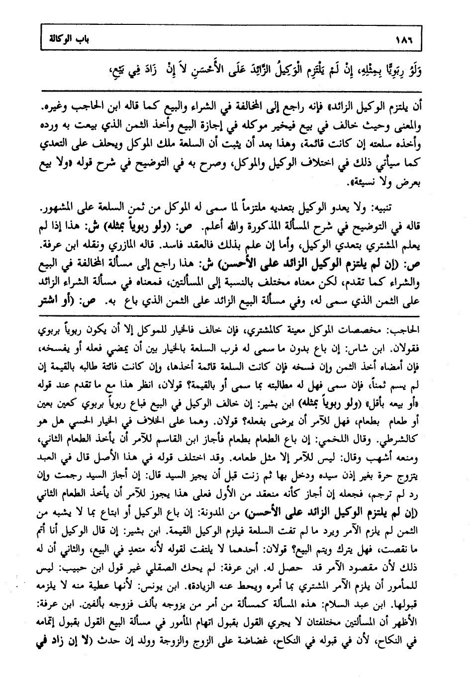 تنبيه: ولا يعد الوكيل بتعديه ملتزما لما سمى له الموكل من ثمن السلعة على المشهور قاله في التوضيح في شرح المسألة المذكورة والله أعلم. ص: (ولو ربويا يمثله) ش: هذا إذا لم يعلم المشتري بتعدي الوكيل، وأما إن علم بذلك فالعقد فاسد قاله المازري ونقله ابن عرفة. ص: (إن لم يلتزم الوكيل الزائد على الأحسن) ش: هذا راجع إلى مسألة المخالفة في البيع والشراء كما تقدم لكن معناه مختلف بالنسبة إلى مسألتين فمعناه في مسألة الشراء الزائد على الثمن الذي سمى له، وفي مسألة البيع الزائد على الثمن الذي باع به. ص: (أو اشتر
