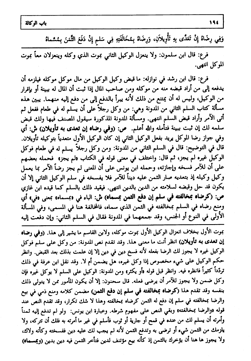 فرع: قال ابن رشد في نوازله: ما قبض وكيل الوكيل من مال موكل موكله فيلزمه أن يدفعه إلى من أراد قبضه منه من موكله ومن صاحب المال إذا ثبت أن المال له ببينة أو بإقرار من الوكيل، وليس له أن يمتنع من ذلك؛ لأنه يبرأ بالدفع إلى من دفع إليه منهما، يبين هذه مسألة كتاب السلم الثاني من المدونة، وهي: من وكل رجلا على أن يسلم له في طعام، ففعل، ثم أتى الآمر، وأراد قبض السلم انتهى. ومسألة المدونة المذكورة سيقول المصنف فيها: ولك قبض سلمه لك إن ثبت ببينة فتأمله والله أعلم. ص: (وفي رضاه إن تعدى به تأويلان) ش: أي، وفي جواز رضا الموكل يريد بفعل الوكيل الثاني إن كان الوكيل الأول متعديا بتوكيله تأويلان قال في التوضيح: قال في السلم الثاني من المدونة: ومن وكل رجلا يسلم له في طعام فوكل الوكيل غيره لم يجز، ثم قال: واختلف في معنى قوله في الكتاب "لم يجز" فحمله بعضهم على أن للآمر فسخه وإجازته، وحمله ابن يونس على أن المعنى لم يجز رضا الآمر بما يعمل وكيل وكيله، إذ بتعديه صار الثمن عليه دينا للآمر فلا يفسخه في سلم الوكيل الثاني إلا أن يكون قد حل وقبضه لسلامته من الدين بالدين انتهى فيقيد ذلك بالسلم كما قيده ابن غازيص (كرضاه بمخالفته في سلم إن دفع الثمن بمسماه) ش: الباء في "بمسماه" بمعنى "في" أي ومنع رضاه في السلم بمخالفته في الثمن الذي سماه، فالمخالفة هنا في المسمى، وفي المسألة الأولى في النوع أو الجنس، وقد جمعهما في المدونة، فقال في السلم الثاني وإن وقعت إليه