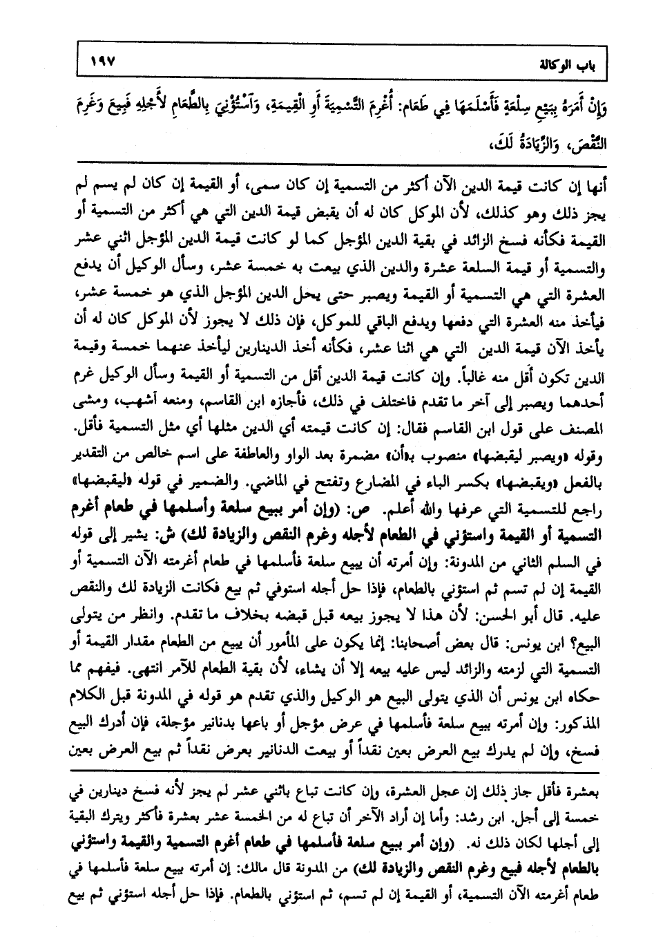 أنها إن كانت قيمة الدين الآن أكثر من التسمية إن كان سمى أو القيمة إن كان لم يسم لم يجز ذلك، وهو كذلك؛ لأن الموكل كان له أن يقبض قيمة الدين التي هي أكثر من التسمية أو القيمة، فكأنه فسخ الزائد في بقية الدين المؤجل كما لو كانت قيمة الدين المؤجل اثني عشر والتسمية أو قيمة السلعة عشرة والدين الذي بيعت به خمسة عشر، وسأل الوكيل أن يدفع العشرة التي هي التسمية أو القيمة، ويصبر حتى يحل الدين المؤجل الذي هو خمسة عشر فيأخذ منه العشرة التي دفعها، ويدفع الباقي للموكل، فإن ذلك لا يجوز؛ لأن الموكل كان له أن يأخذ الآن قيمة الدين التي هي اثنا عشر، فكأنه أخذ الدينارين؛ ليأخذ عنهما خمسة، وقيمة الدين تكون أقل منه غالبا، وإن كانت قيمة الدين أقل من التسمية أو القيمة، وسأل الوكيل غرم أحدهما، ويصبر إلى آخر ما تقدم فاختلف في ذلك فأجازه ابن القاسم، ومنعه أشهب ومشى المصنف على قول ابن القاسم فقال: إن كانت قيمته أي الدين مثلها أي مثل التسمية، فأقل، وقوله "ويصبر ليقبضها" منصوب بـ"أن" مضمرة بعد الواو والعاطفة على اسم خالص من التقدير بالفعل "ويقبضها" بكسر الباء في المضارع وتفتح في الماضي والضمير في قوله "ليقبضها" راجع للتسمية التي عرفها والله أعلم. ص: (وإن أمر ببيع سلعة وأسلمها في طعام أغرم التسمية أو القيمة واستؤني في الطعام لأجله وغرم النقص والزيادة لك) ش: يشير إلى قوله في السلم الثاني من المدونة وإن أمرته أن يبيع سلعة فأسلمها في طعام أغرمته الآن التسمية أو القيمة إن لم تسم، ثم استؤني بالطعام فإذا حل أجله استوفى، ثم بيع فكانت الزيادة لك والنقص عليه قال أبو الحسن: لأن هذا لا يجوز بيعه قبل قبضه بخلاف ما تقدم. وانظر من يتولى البيع ابن يونس قال بعض أصحابنا: إنما يكون على المأمور أن يبيع من الطعام مقدار القيمة أو التسمية التي لزمته والزائد ليس عليه بيعه إلا أن يشاء؛ لأن بقية الطعام للآمر انتهى. فيفهم مما حكاه ابن يونس أن الذي يتولى البيع هو الوكيل، والذي تقدم هو قوله في المدونة قبل الكلام المذكور، وإن أمرته ببيع سلعة فأسلمها في عرض مؤجل أو باعها بدنانير مؤجلة فإن أدرك البيع فسخ، وإن لم يدرك بيع العرض بعين نقدا أو بيعت الدنانير بعرض نقدا، ثم بيع العرض بعين