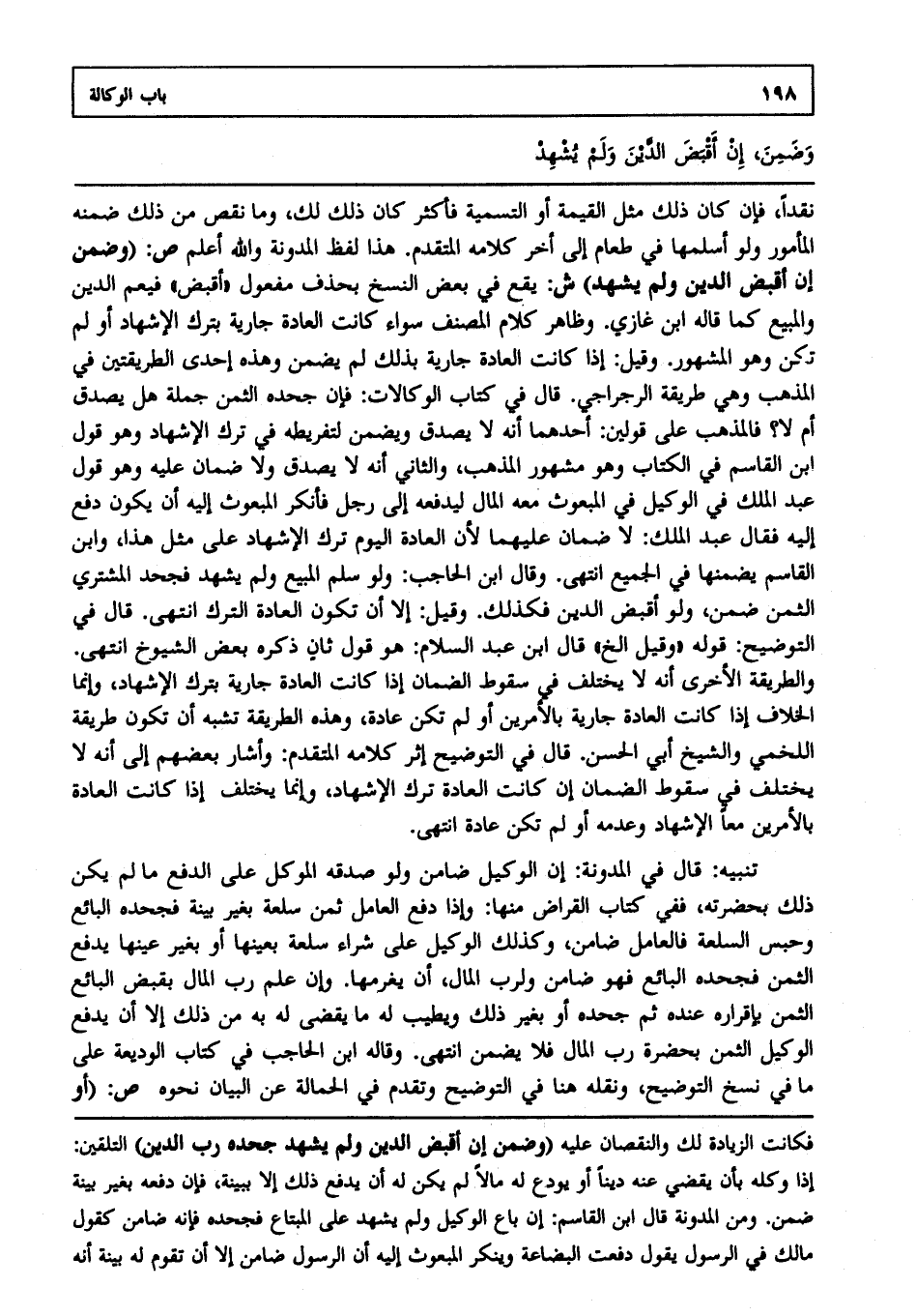 تنبيه: قال في المدونة: إن الوكيل ضامن ولو صدقه الموكل على الدفع ما لم يكن ذلك بحضرته ففي كتاب القراض منها، وإذا دفع العامل ثمن سلعة بغير بينة فجحده البائع، وحبس السلعة فالعامل ضامن، وكذلك الوكيل على شراء سلعة بعينها أو بغير عينها يدفع الثمن، فجحده البائع، فهو ضامن ولرب المال أن يغرمها وإن علم رب المال بقبض البائع الثمن بإقراره عنده، ثم جحده أو بغير ذلك ويطيب له ما يقضى له به من ذلك إلا أن يدفع الوكيل الثمن بحضرة رب المال فلا يضمن انتهى. وقاله ابن الحاجب في كتاب الوديعة على ما في نسخ التوضيح ونقله هنا في التوضيح وتقدم في الحمالة عن البيان نحوه. ص: (أو