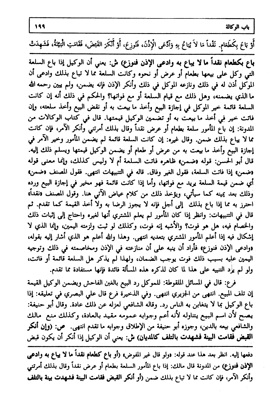باع بكطعام نقدا ما لا يباع به وادعى الإذن فنوزع) ش: يعني أن الوكيل إذا باع السلعة التي وكل على بيعها بطعام أو عرض أو نحوه وكانت السلعة مما لا تباع بذلك وادعى أن الموكل أذن له في ذلك ونازعه الموكل في ذلك وأنكر الإذن فإنه يضمن ولم يبين رحمه الله ما الذي يضمنه وهل ذلك مع قيام السلعة أو مع فواتها؟ والحكم في ذلك أنه إن كانت السلعة قائمة خير الموكل في إجازة البيع وأخذ ما بيعت به أو نقض البيع وأخذ سلعته وإن فاتت خير في أخذ ما بيعت به أو تضمين الوكيل قيمتها قال في كتاب الوكالات من المدونة: وإن باع المأمور سلعة بطعام أو عرض نقدا، وقال بذلك أمرتني وأنكر الآمر فإن كانت مما لا يباع بذلك ضمن، وقال غيره: إن كانت السلعة قائمة لم يضمن المأمور وخير الآمر في إجازة البيع وأخذ ما بيعت به من عرض أو طعام أو يضمن الوكيل قيمتها ويسلم ذلك إليه قال أبو الحسن: قوله "ضمن" ظاهره فاتت السلعة أم لا وليس كذلك، وإنما معنى قوله "ضمن" إذا فاتت السلعة فقول الغير وفاق قاله في التنبيهات انتهى. فقول المصنف "ضمن" أي ضمن قيمة السلعة يريد مع فواتها، وأما إذا كانت قائمة. فهو مخير في إجازة البيع، ورده وذلك بعد يمينه كما سيأتي ويؤخذ ذلك من كلام عياض الآتي هنا وقول المصنف "نقدا" احترز به مما إذا باع بذلك إلى أجل، فإنه لا يجوز الرضا به، ولا أخذ القيمة كما تقدم. ثم قال في التنبيهات: وانظر إذا كان المأمور لم يعلم المشتري أنها لغيره واحتاج إلى إثبات ذلك والخصام فيه هل هو فوت؟ والأشبه أنه فوت، وكذلك لو ثبت ولزمته اليمين وإنما الذي لا إشكال فيه إذا أعلم المأمور المشتري بتعديه انتهى، وهذا والله أعلم هو الذي أشار إليه بقوله، "وادعى الإذن فنوزع" فأراد أن ينبه على أن منازعته في الإذن ومخاصمته في ذلك وتوجيه اليمين عليه بسبب ذلك فوت يوجب الضمان، ولهذا لم يذكر هل السلعة قائمة أو فاتت ولو لم يرد التنبيه على هذا لما كان لذكره هذه المسألة فائدة فإنها: مستفادة مما تقدم.