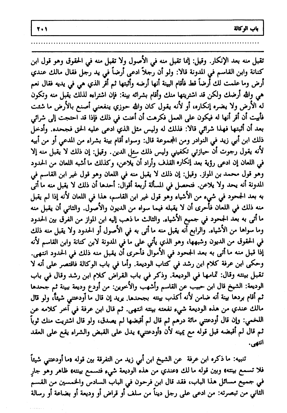 تقبل منه بعد الإنكار. وقيل: إنما تقبل منه في الأصول ولا تقبل منه في الحقوق وهو قول ابن كنانة وابن القاسم في المدونة قالا: ولو أن رجلا ادعى أرضا في يد رجل فقال: ما لك عندي أرض، وما علمت لك أرضا قط فأقام البينة أنها أرضه وأثبتها، ثم أقر الذي هي في يديه فقال: نعم هي والله أرضك ولكن قد اشتريتها منك وأقام بشرائه بينة فإن اشتراءه لذلك يقبل منه، وتكون له الأرض ولا يضره إنكاره أو؛ لأنه يقول كان والله حوزي ينفعني أصنع بالأرض ما شئت فأبيت أن أقر أنها له فيكون علي العمل فكرهت أن أعنت في ذلك فإذ قد احتجت إلى شرائي بعد أن أثبتها فهذا شرائي قالا فذلك له، وليس مثل الذي ادعى عليه الحق، فجحده وأدخل ذلك ابن أبي زيد في النوادر. ومن المجموعة قال: وسواء أقام بينة بشراء من المدعي أو من أبيه؛ لأنه يقول رجوت أن حيازتي تكفيني، وليس ذلك مثل المدين، وقيل إن ذلك لا يقبل منه إلا في اللعان إن ادعى رؤية بعد إنكاره القذف، وأراد أن يلاعن، وكذلك ما أشبه اللعان من الحدود وهو قول محمد بن المواز وقيل إن ذلك لا يقبل منه في اللعان وهو قول غير ابن القاسم في المدونة إنه يحد ولا يلاعن فتحصل في المسألة أربعة أقوال أحدها: أن ذلك لا يقبل منه ما أتى به بعد الجحود في شيء من الأشياء وهو قول غير ابن القاسم هذا في اللعان؛ لأنه إذا لم يقبل منه ذلك في اللعان فأحرى أن لا يقبله فيما سواه من الديون والأصول والثاني: أن يقبل منه ما أتى به بعد الجحود في جميع الأشياء والثالث: ما ذهب إليه ابن المواز من الفرق بين الحدود، وما سواها من الأشياء والرابع: أنه يقبل منه ما أتى به في الأصول أو الحدود ولا يقبل منه ذلك في الحقوق من الديون وشبهها، وهو الذي يأتي على ما في المدونة لابن كنانة وابن القاسم؛ لأنه إذا قبل منه ما أتى به بعد الجحود في الأموال، فأحرى أن يقبل منه ذلك في الحدود انتهى. وحكى ابن عرفة كلام ابن رشد في كتاب الوديعة، وأما في باب الوكالة، فاقتصر على أنه لا تقبل بينته وقال تمامها في الوديعة وذكر في باب القراض كلام ابن رشد وقال في باب الوديعة الشيخ قال ابن حبيب عن ابن القاسم وأشهب والأخوين من أودع وديعة ببينة، ثم جحدها، ثم أقام بردها بينة أنه ضامن؛ لأنه أكذب بينته بجحدها يريد إن قال ما أودعتني شيئا ولو قال ما لك عندي من هذه الوديعة شيء نفعته بينته انتهى. ثم قال ابن عرفة في آخر كلامه عن اللخمي وإن قال أودعتني مائة درهم، ثم قال لم أقبضها لم يصدق ولو قال اشتريت منك ثوبا، ثم قال: لم أقبضه قبل قوله مع يمينه؛ لأن "أودعتني" يدل على القبض والشراء يقع على العقد انتهى.